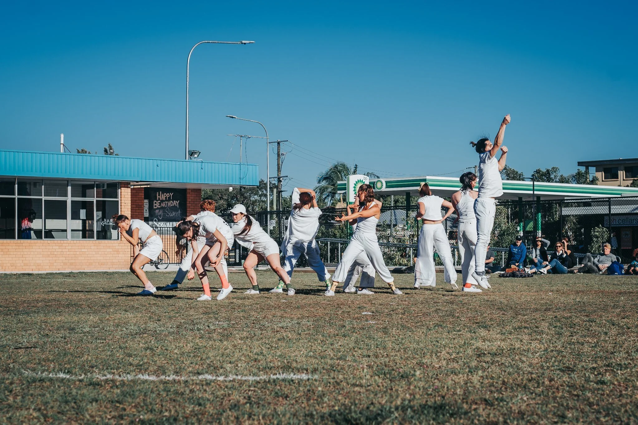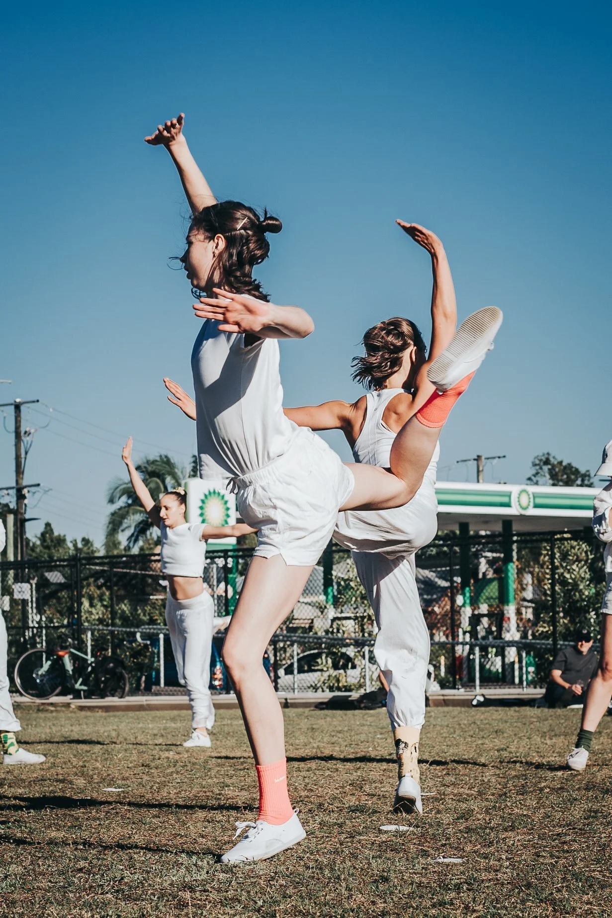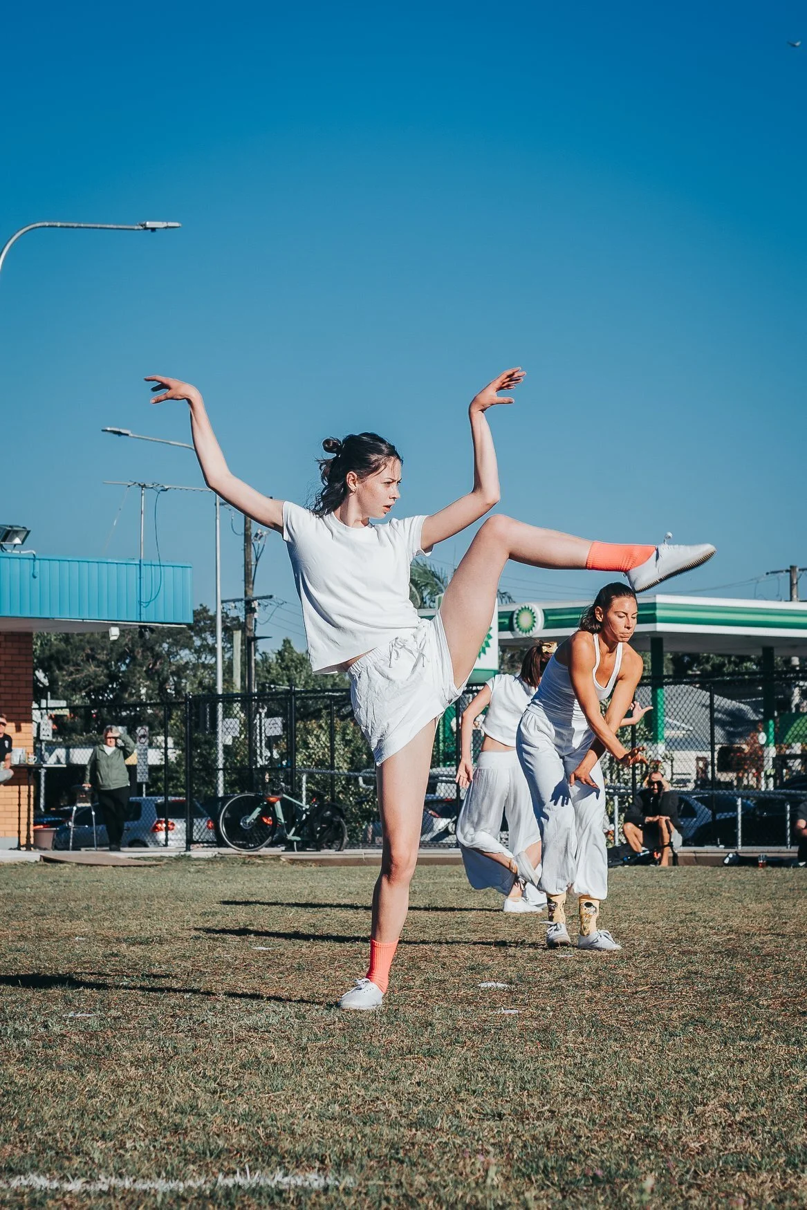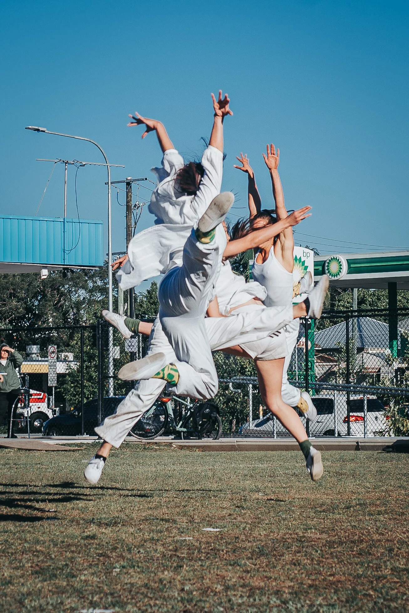 I set up a small studio space under my house where I could train and attempt to remain creative. I began exploring choreography that spoke to concepts of isolation, my states of mental health and concepts of connectivity. Initially I created the choreography for a schools protest, working with Shailer Park State High School students via video. It was an important outlet for me in this time where I did struggle with the unknown and a sense of loss. It was a slow creative process but one very much connecting to my understanding of now… it provided an important outlet in a very hard time. The choreography became an artefact of my realities of Covid-19 as an dance at that time. Then, through a need to continue to provide the Phluxus2 community a place to train and remain creative, we started meeting once a week in an outdoor space to train, dance and share the choreography to a group of 12 performers. It started as a way to keep us together and lift our spirits and what emerged was a stunning new short work that was able to remain safe within covid and use some of the parameters as a creative framework. Each dancer had their own 1.5 square meter space, the work was viewed in a 360 degree perspective allowing to to experiment with patterns and active space, exploring content directly derived from the isolation experience. Being able to share this work with our close community through live performance was a gift.