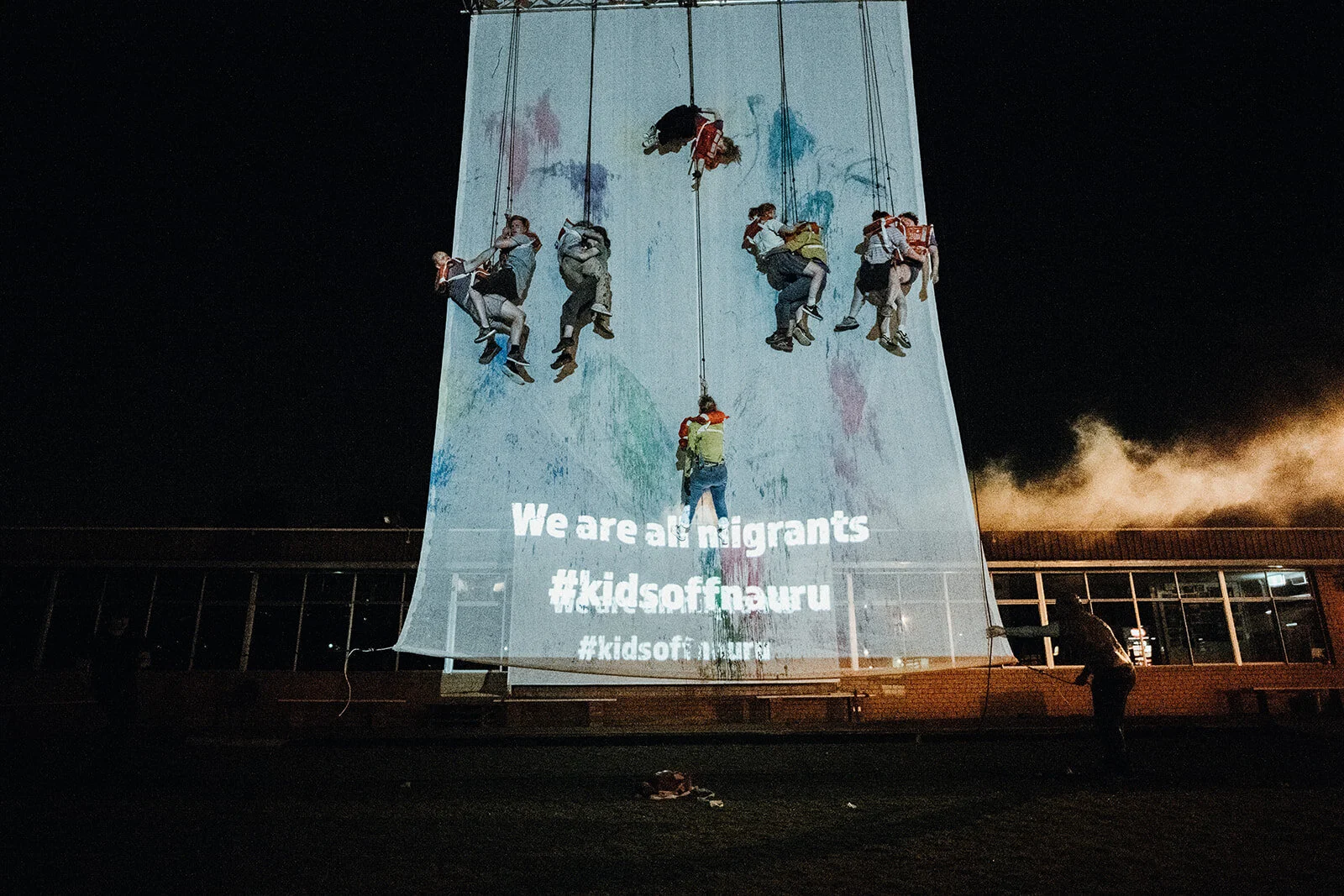 They fall off the crane, dangling on the thinnest of spider web lines, tens of metres high. The simple projection of writhing seas and the juxtaposition of these bodies struggling in air was so, so effective. It's so easy to forget, to distance oneself from the harsh realities of refugees. We are so safe here.