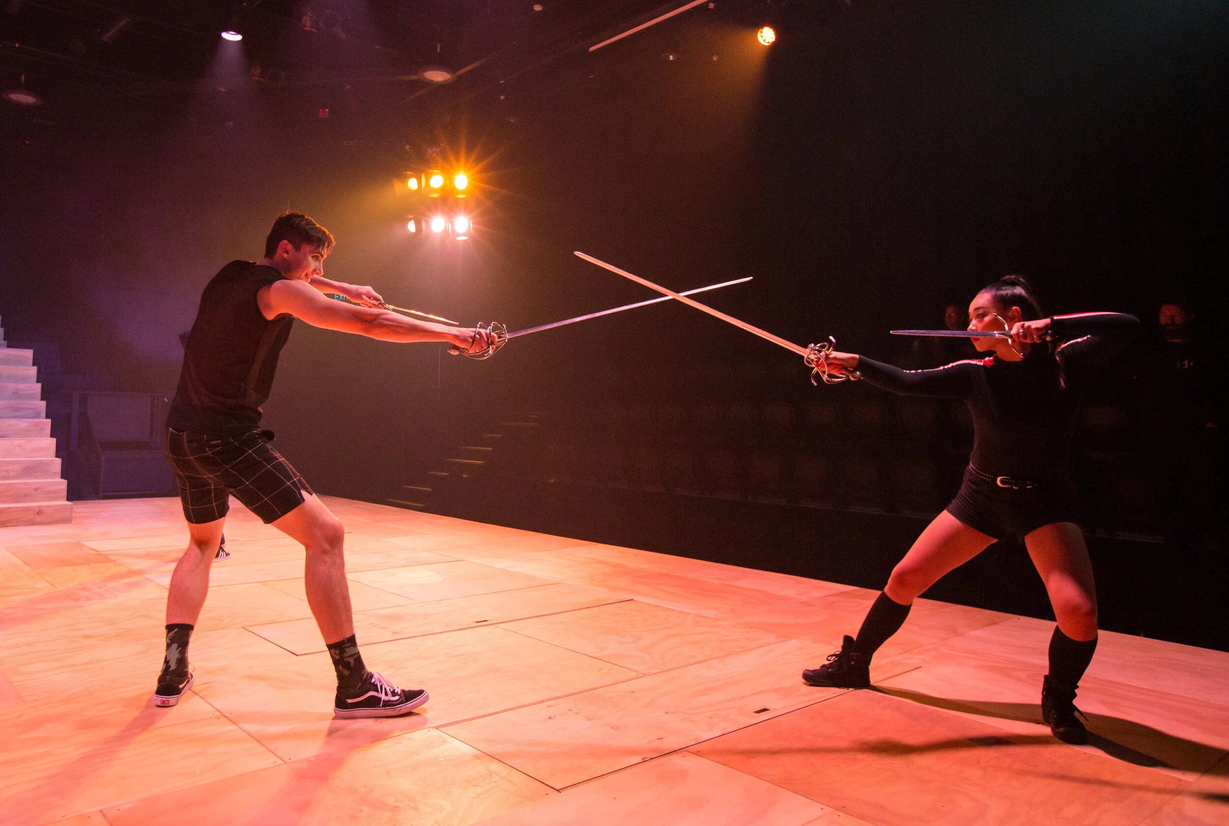 AnthonySpinaze’s set design, while appearing minimalist was exceptionally versatile,with hidden trap doors and compartments, none more impressive than theCapulet’s monument, an image that will stay for me for quite some time. Nigel Poulton’s fight choreography was on themark, with the feud between Mercutio and Tybalt (Wei Lan Zhong) being so stylised and at performed at such high-energy that it seemed painfully real forthe audience. The entire scene was beautifully executed in its design, with thebodies of Mercutio and Tybalt being laid on a red sheet and dragged off stage by the other characters, complimented by an electrifying soundscape by Anna Whitaker. Katie Sfetkidis lighting design was remarkable, especially the balcony scene in which the night sky is somehow projected from the panels inthe set onto the ceiling.