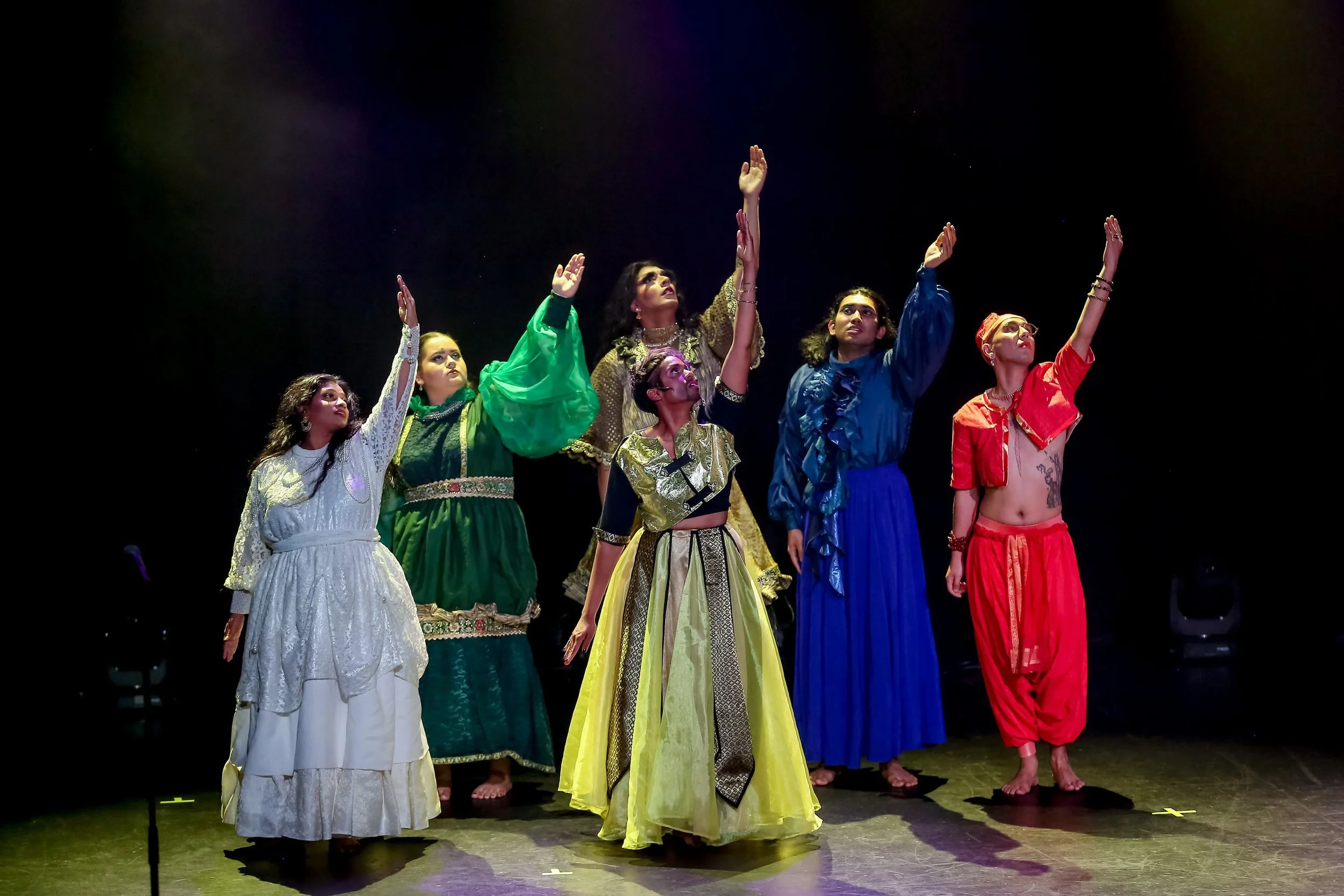 I panic silently as the doors to The Tivoli open. I fret some more as I find a chair for myself and sink into it. I sit upright. I feel my jaws tighten. The theatre is awash with warm purple lights and from where I am seated, the brazenly flashy disco ball is in my direct line of vision. I am in pop heaven. Lady Gaga’s ‘Telephone’ has come on. It is also the song which features Beyoncé. Incidentally, it is Queen Bey’s birthday. I know a party awaits, but first I must pray. ‘Please let me not get in the way of enjoying this’, I say to myself. It is a plea to my senses and sensibilities to receive The Naavikaran Collective’s communion with keenness and kindness.