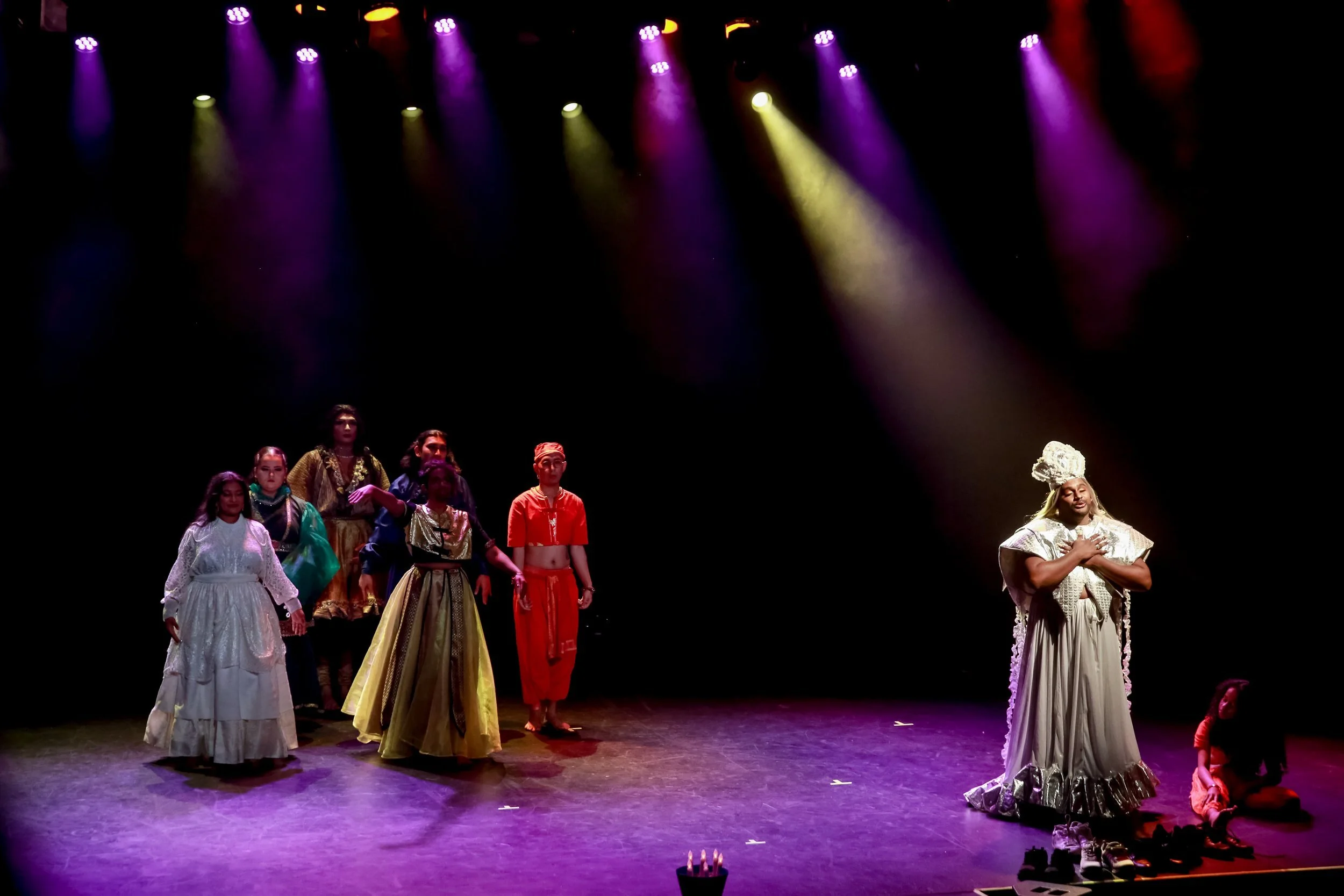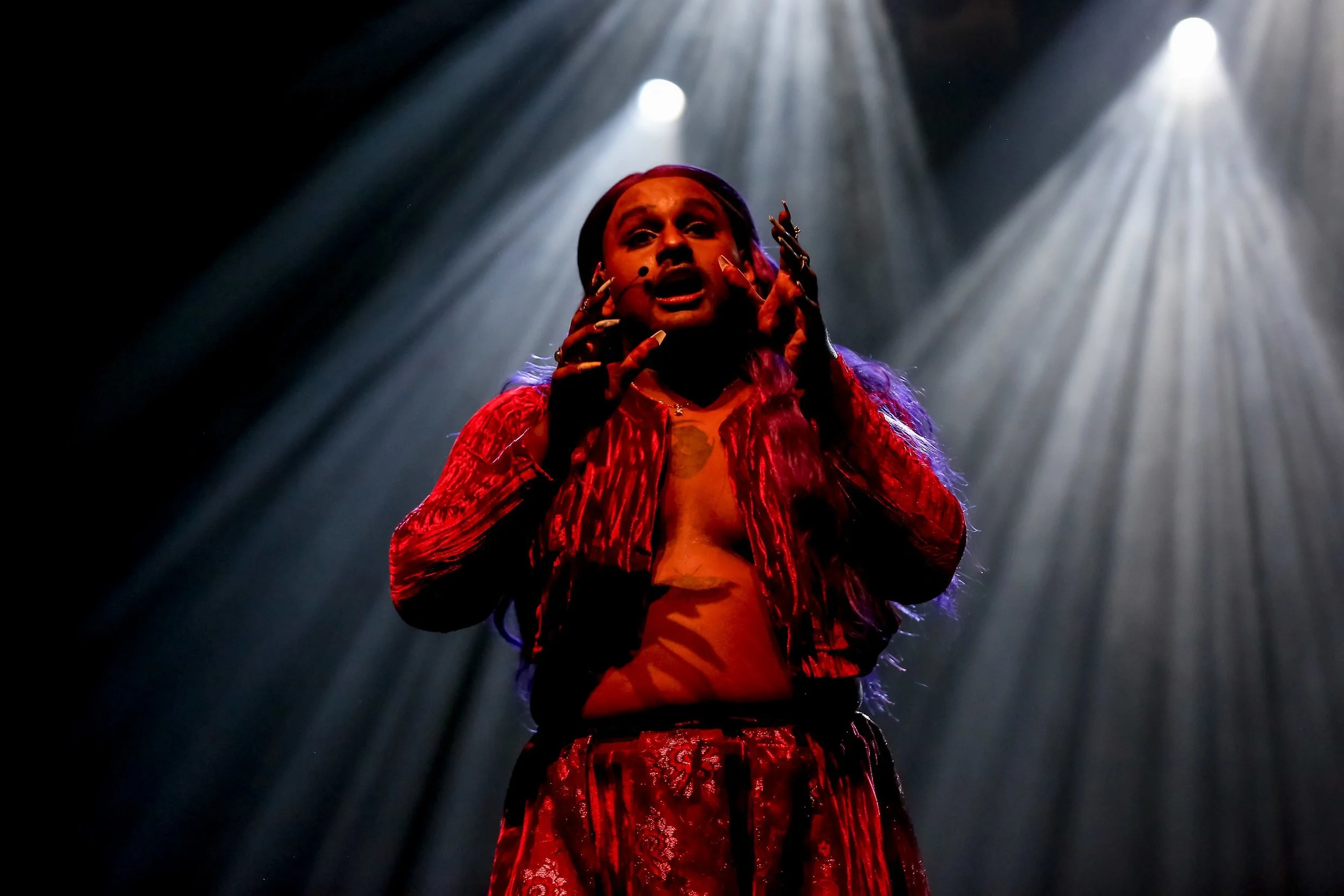 An inky darkness suddenly envelopes the theatre. Naavikaran’s voice fills the venue. “Welcome to Brown Church. Welcome home.” Something about these parting words of their prologue uttered so warmly in pitch-black silence has me choked with emotion. The mood is uplifted at once when Brown Church opens with the racy number, ‘Where Are You From?’ Naavikaran’s lyrical genius is no sleight of hand. This is not a well-rehearsed rendition of imagery and sentiment strung together for pure performative pleasure. One understands that the wellspring of their immersive musical storytelling ways is an invitation to journey with and access Naavikaran’s former selves in the most precious, private, and sacred of spaces situated within and outside of their complex being.