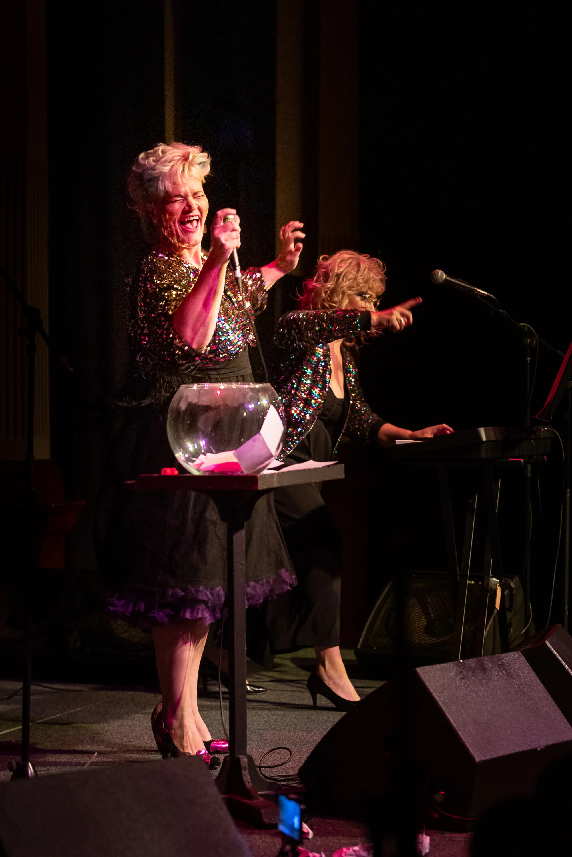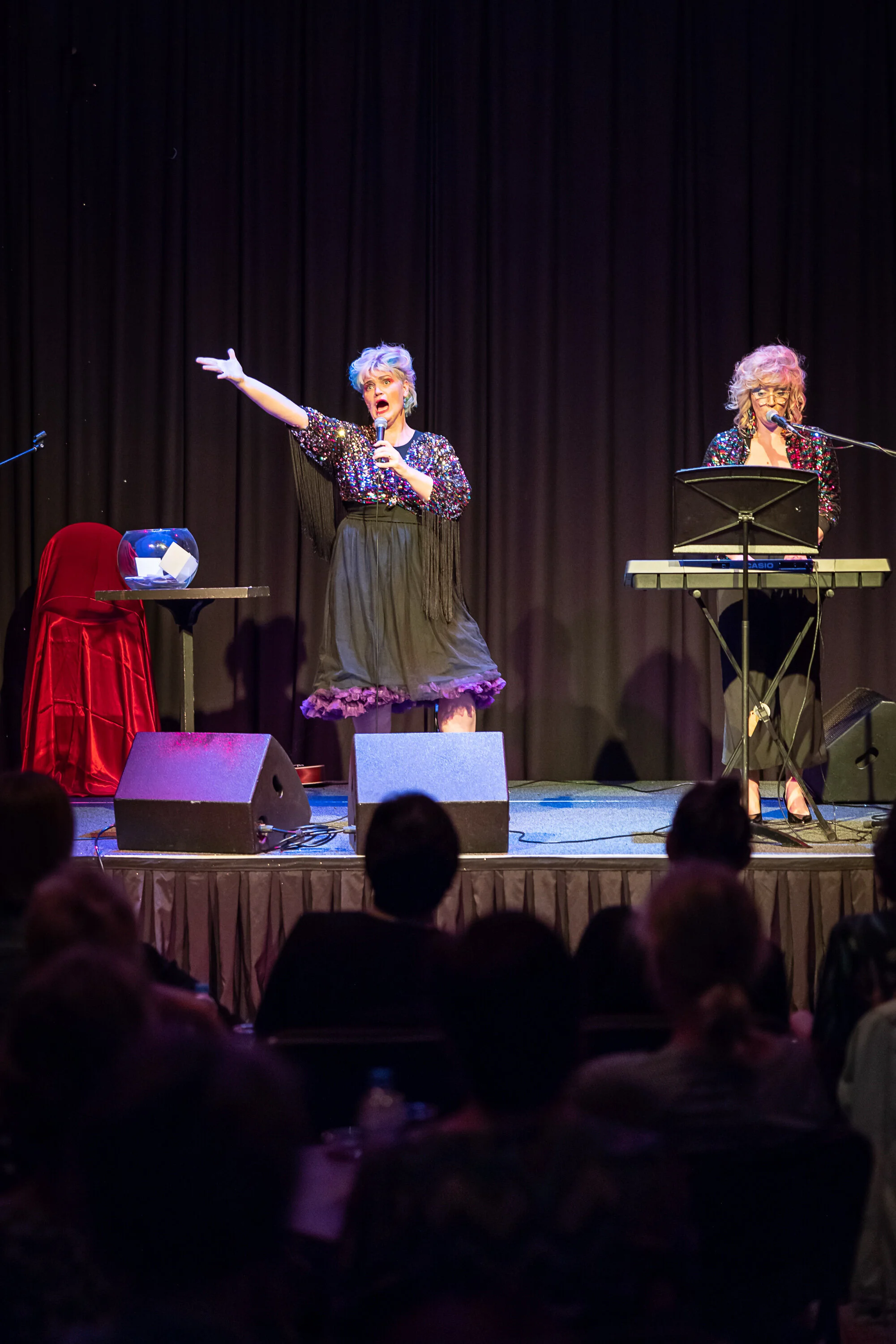 Jenny and her sister Angie, who did a fabulous job on the keyboard, arrived on stage with incredible presence. They were shining in their sequin outfits. With deft skill Jenny began creating a story that was unique to this evening, not heard before or since! She became Jean Sunbeam using names and places provided by the audience. She had a husband called Cameron and a stepson who was a mass murderer. She reached into the fishbowl often and built on the details of this new character. It was hilarious to see her reactions to some of the info provided. In our audience, it seems dildo’s were a popular choice!