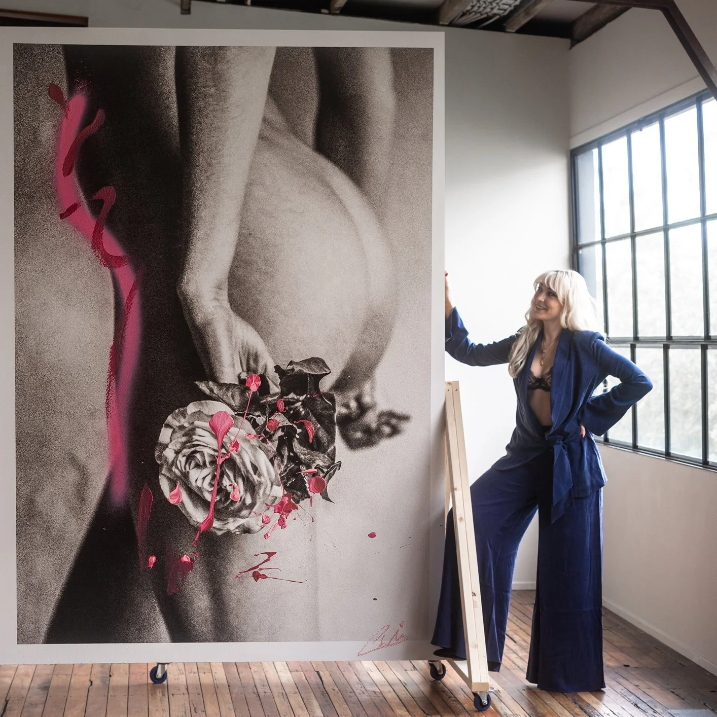 In her 10 year career she’s forged who own unique creative path, which has included several solo gallery shows, and directed shoots for Universal Music, HBO, Disney and Warner Bros. In recent years she’s taken to exploring the negative impact of Social Media on art, nothing that it is “a graveyard for originality, creativity, and authenticity”.