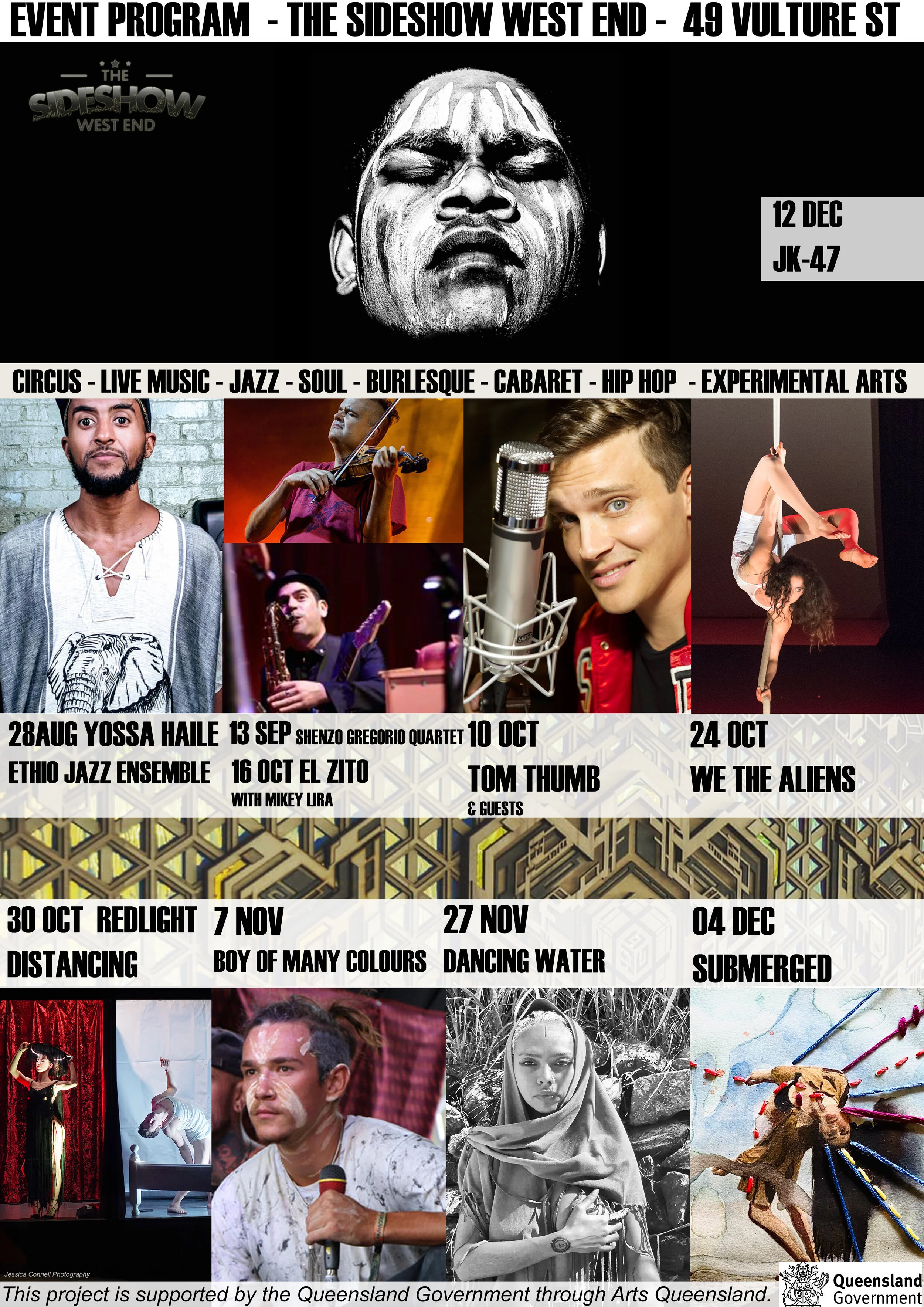 This Saturday, 12 December, marks the closing of the Sideshow West End Fringe program, with a massive program of music headlined at 8:30pm by First Nations rappers JK-47 and the Boy of Many Colours. JK-47 has just won Triple J unearthed artist of the year. The program will also feature the album launch of Yossa Haile and his Ethio Jazz Ensemble from 5.30pm and the Swampy Sessions Cabaret featuring the Hinterlanders at 2.30pm. Virag Dombay spoke to Dave recently about the development of the West End Fringe Program and what punters can expect from this weekend’s closing events.