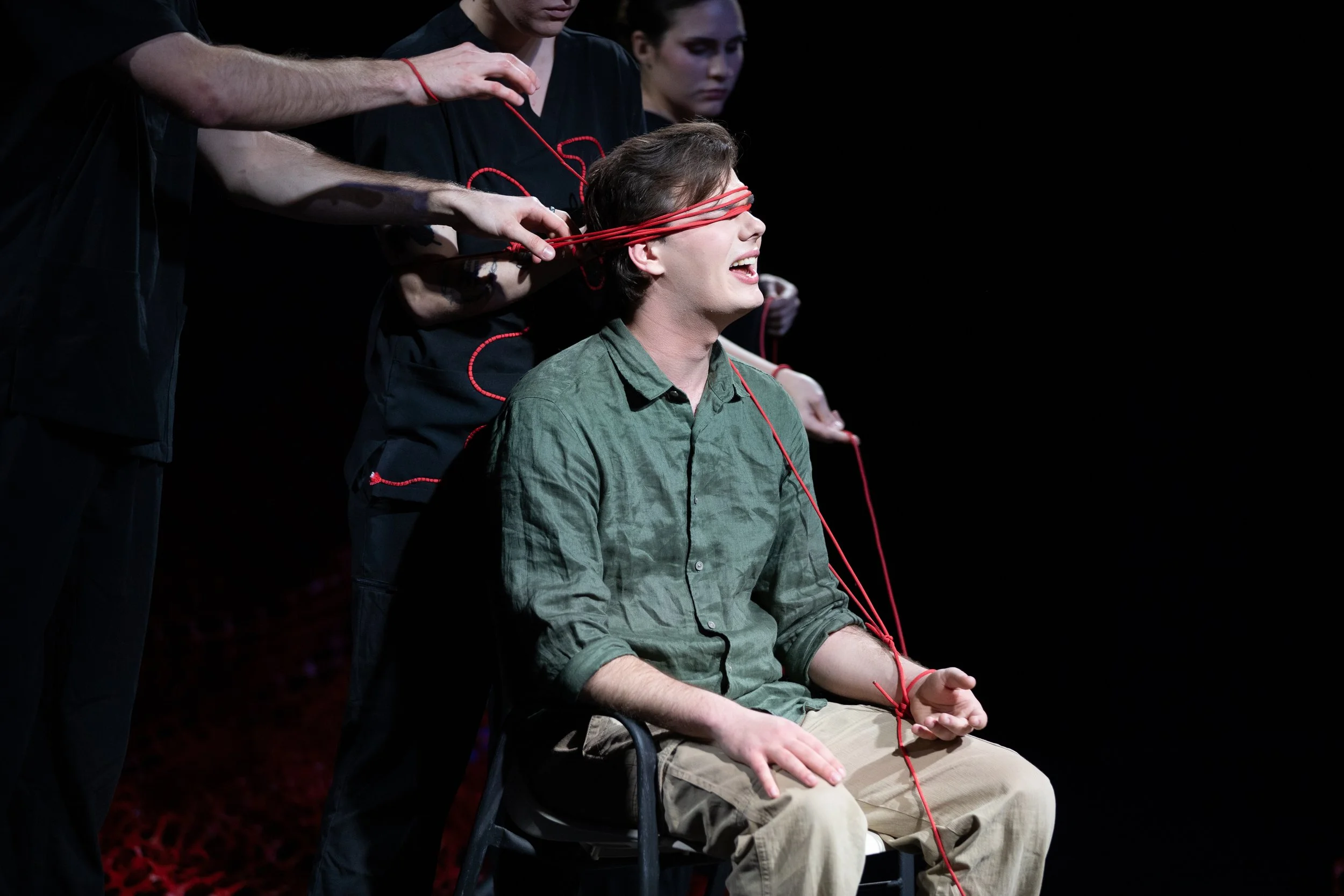 Clad in black, three performers (The Chorus / JJ Jones, Alexandra Macdonald and Harry Witherall) enter the space dragging Caleb Hockings (The Narrator). The foursome is tethered by three balls of red rope which is held firmly by each performer in the ensemble. These ropes, in various stages of being unravelled, are firmly attached to Hockings. The trio ensemble take up their positions under lights that are dimmed. Meanwhile Hockings, outfitted casually in contrasting light-coloured cargo pants and shirt, takes his place on the chair that is strategically placed in the middle of this group. This front and centre placement under the opposing glare of a single spotlight lends an air of vulnerability to Hocking's onstage persona.