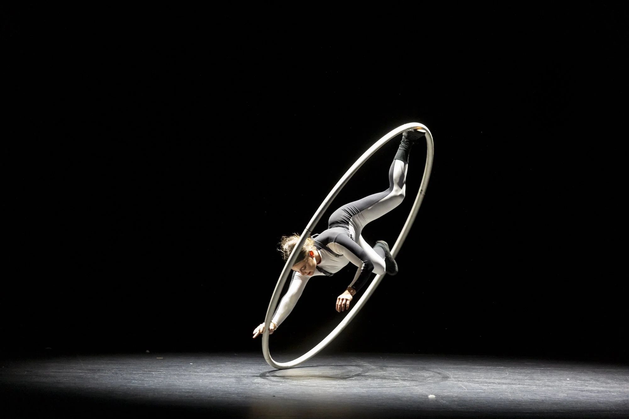 In stark contrast, Georgia Webb’s cyr wheel solo was so striking because of the play with light and shadow. Her costume split into stark white front and black back halves, which looked incredible as she spun around inside that wheel.