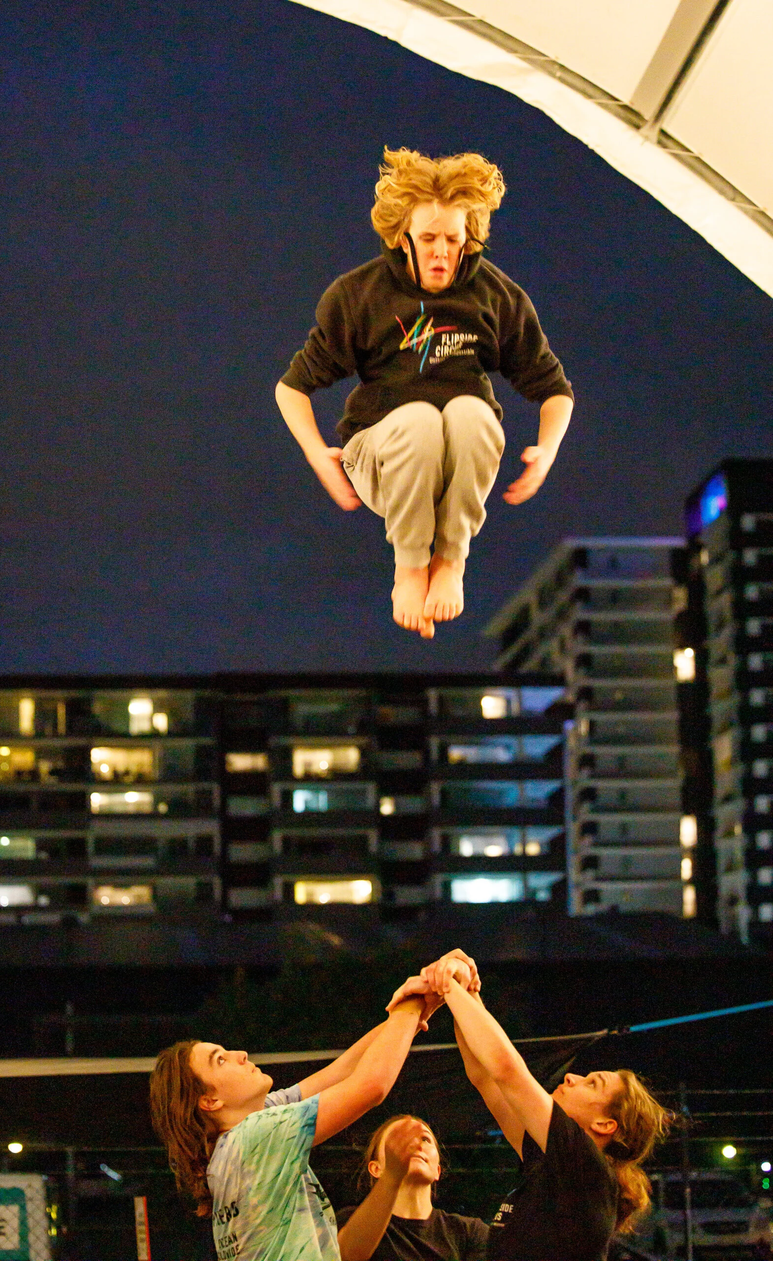 A young circus performer flips high into the air. Image: Geoff Lawrence.