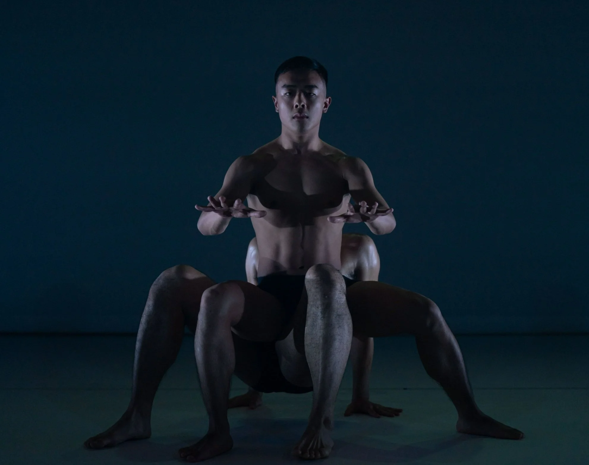 William ‘Billy’ Keohavong and Ko Yamada are positioned on opposite sides of the stage; they engage in a series of movements that becomes longer and more complex as new sections buffer. They move in complete isolation. The only parts of the dancer that interact with each other are their shadows on the scrim behind them. Dark, intense lighting. Harsh, flailing music. The game is loading. The player characters are being torn from their homes deep in the software.