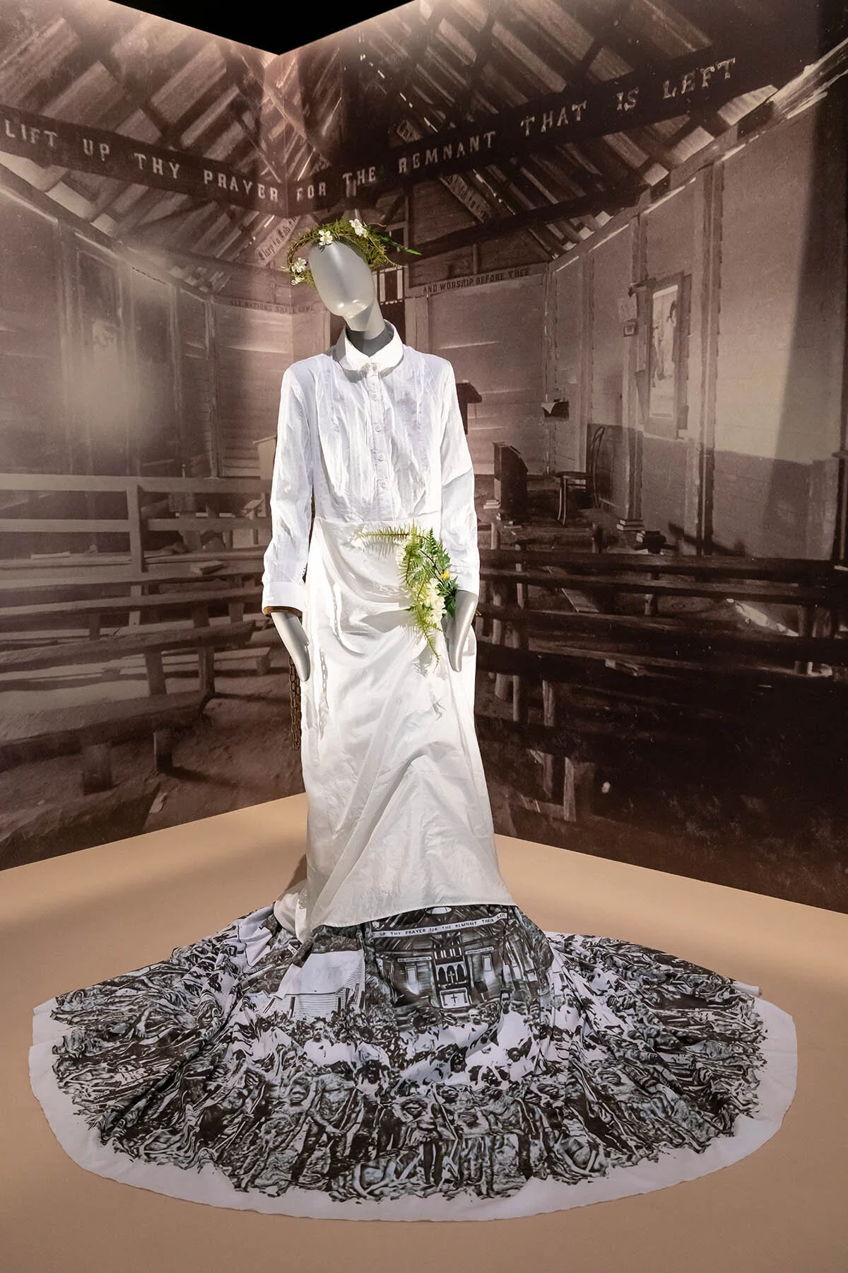 Both were of First Nations descent and agreed to celebrate their wedding by acknowledging the history of their ancestors. This resulted in the train of the wedding dress bearing images of past generations (hence the warning on entry). The final printed design was a confronting reminder of the tragic history and traumatic experiences of our First Nations brothers and sisters. The thought and creative input that resulted in this exquisite design deserves respect and admiration.