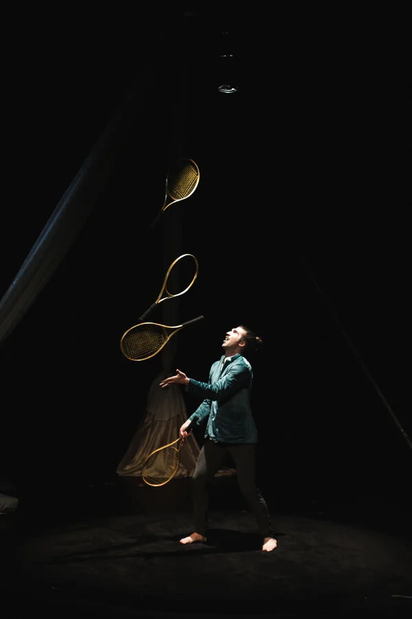 A standout of the show was an incredibly intricate juggling routine utilising both racquets and balls that that brought on multiple spontaneous rounds of applause from the audience. He balanced such high energy crowd pleasers with moments graceful performance and intimate character work. This was particularly highlighted by short pieces of dance mixed with acrobatics that were truly beautiful to watch and aperfectly time sleight of hand trick that made us all gasp.