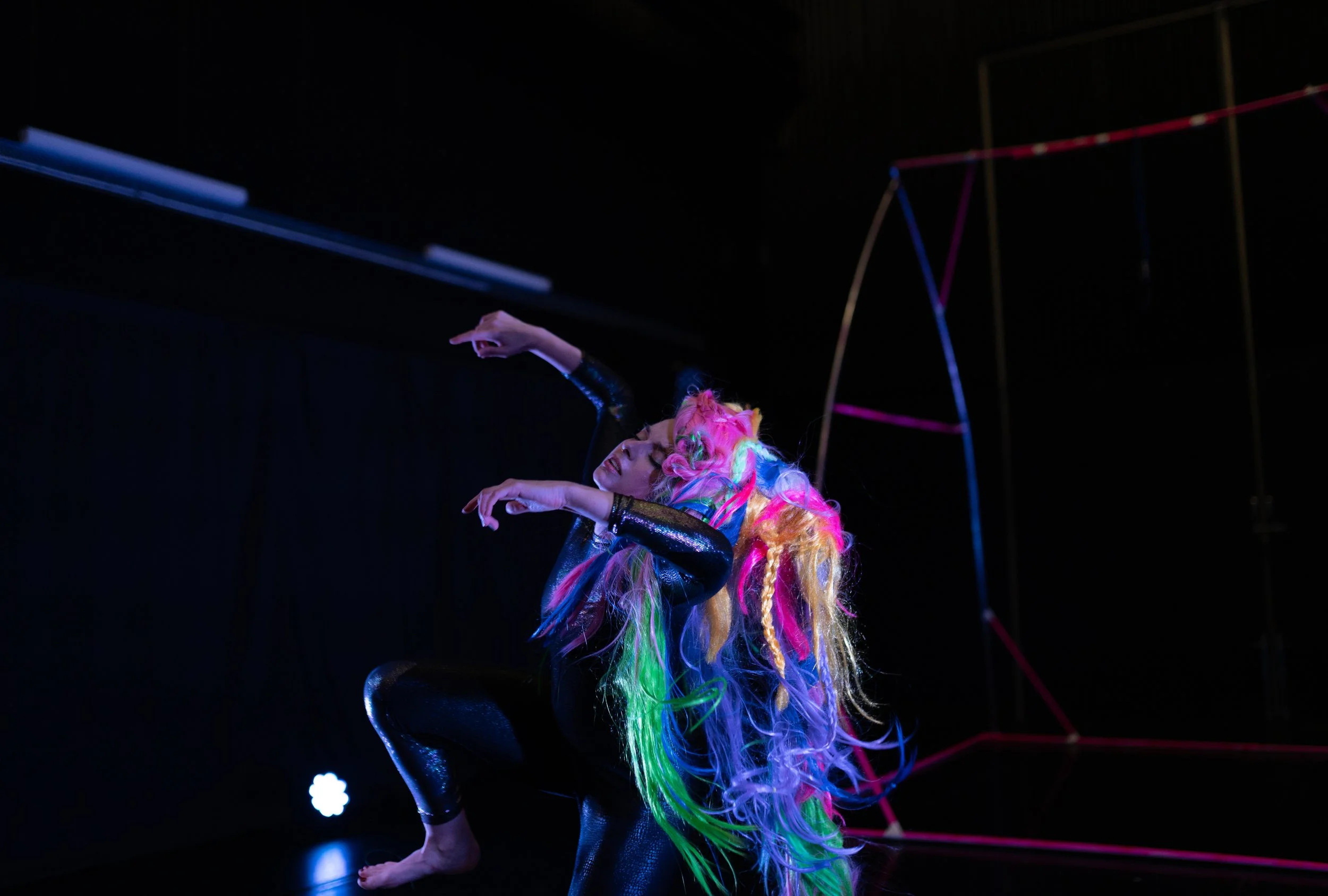 I was privileged to enjoy two fresh dance performances at PIP Theatre as part of Melt Fest. The first, a short intro piece performed by Jade Brider, dancer, choreographer and person of interest to be seen everywhere these days. Due to a series of unfortunate prior engagements, this is not the first time it has been performed but the first time I’ve been able to see the solo work Banshee31000. Shades of scifi, this short piece sees the entrance of our protagonist as she robotically paces forward endlessly, before donning an eclectic rainbow woollen mask/hat/wig/cap/cloak suspended in rigging. Upon donning the hat the dancers movement spun into increasingly frenetic variations. It made me wonder if the body wears the soul like a hat. I thought of shaman’s and how they wore bespoke and sacred costumery to summon gods and ancestors. If the body is just the body, and the soul a flavour that passes through the mortal vessel. The ultimate denouement saw the body and soul discard the mask and return to its original self, the same and yet changed, free and yet having escaped.