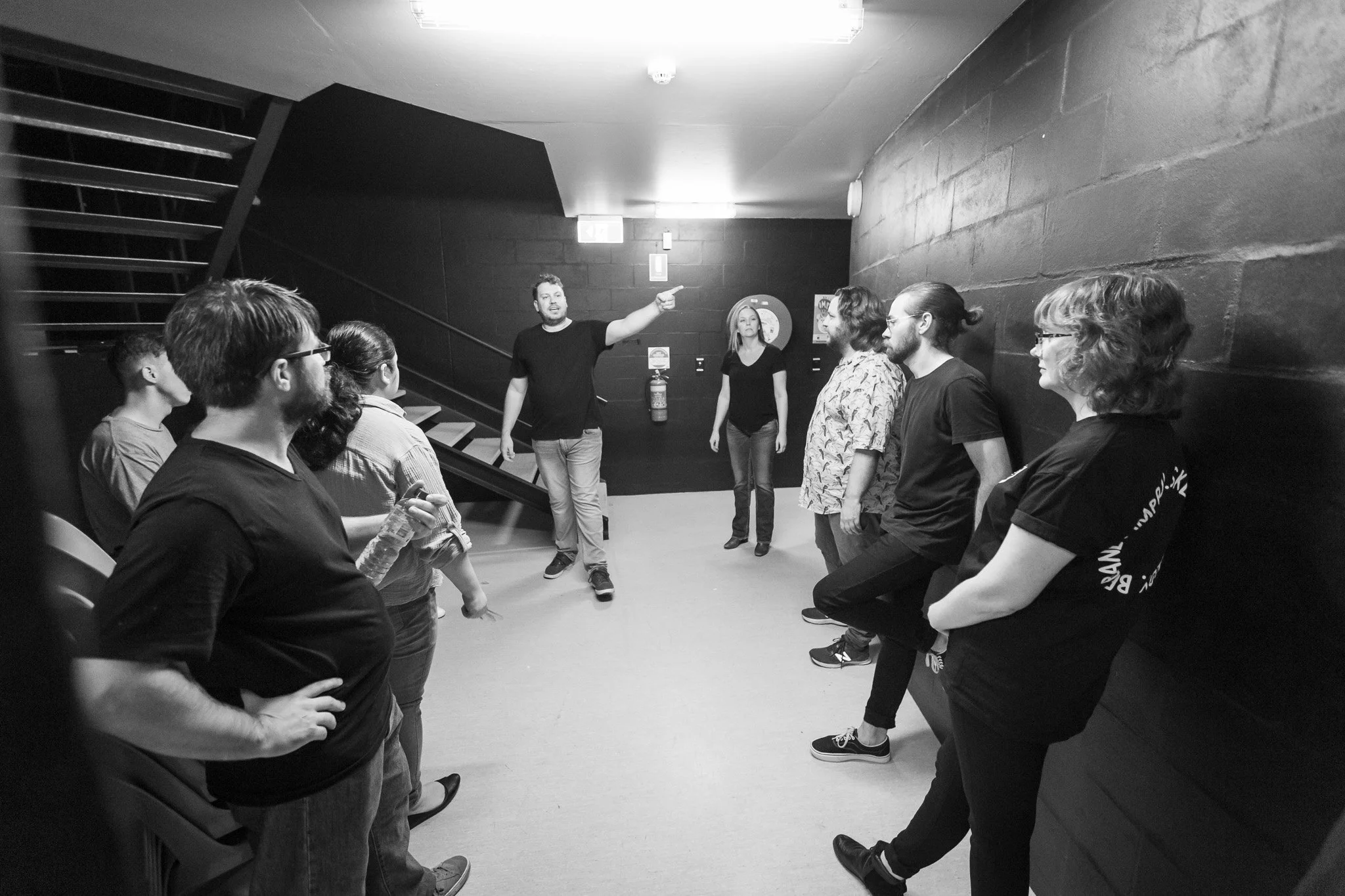 We have a bar and lobby, classroom and a black box theatre with lights and sound and a projector. The theatre capacity is flexible but we have seats for up to 96 patrons!
