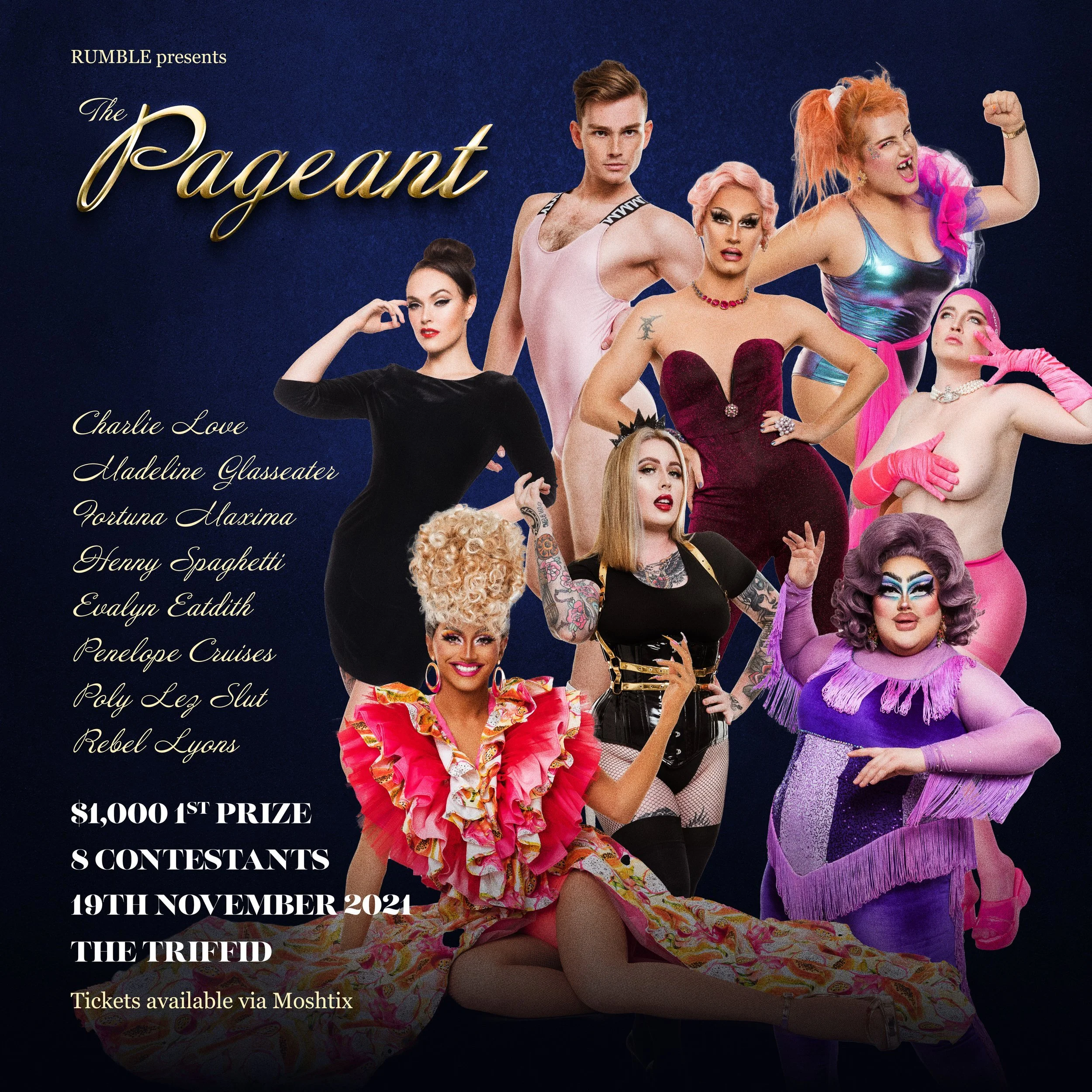 It is exactly 100 years since the first Miss America Beauty Pageant was held and, since then, women, men, teens, and toddlers have been competing for the elusive sash and crown that would herald them the most conventionally attractive of all the land. Meanjin based photographer, producer, and creator of Rumble, Joel Devereux, seeks to take this traditional format and turn it on its rhinestoned tiara-laden head. Transforming The Triffid stage for one-night-only (Friday the 19th of November 2021), The Pageant sees eight contenders compete in a phantasmagoria of drag, cabaret, sideshow and more!