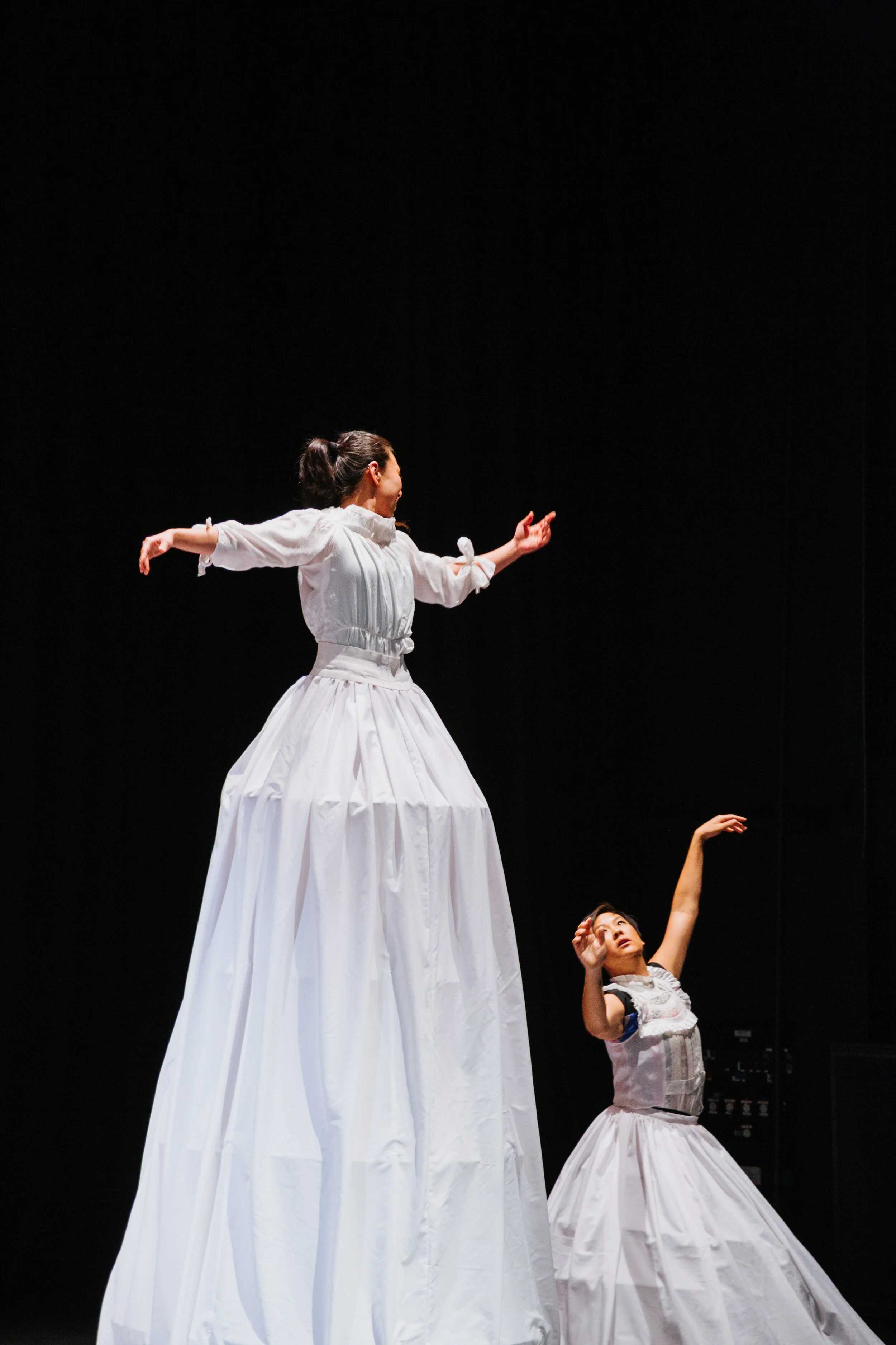 Muto and Woo emerged through the skirts their posture rising with the music evocative of a waltz, revealing the full body of huge, hooped skirts with bustles reminiscent of a Victorian era dress. In a powerful acrobatic moment Muto continued to rise gradually, until she was towering like a giantess above us. It became obvious she must have been standing on top of Church, hidden completely underneath the fabric and framework of the skirt, revealed to be extraordinarily long. It was a thrilling homage to child prodigy Mendelssohn, whose teacher Friedrich Zelter, intending only to imply the highest of praise, wrote to Johann Wolfgang von Goethe about her, “she plays like a man”.