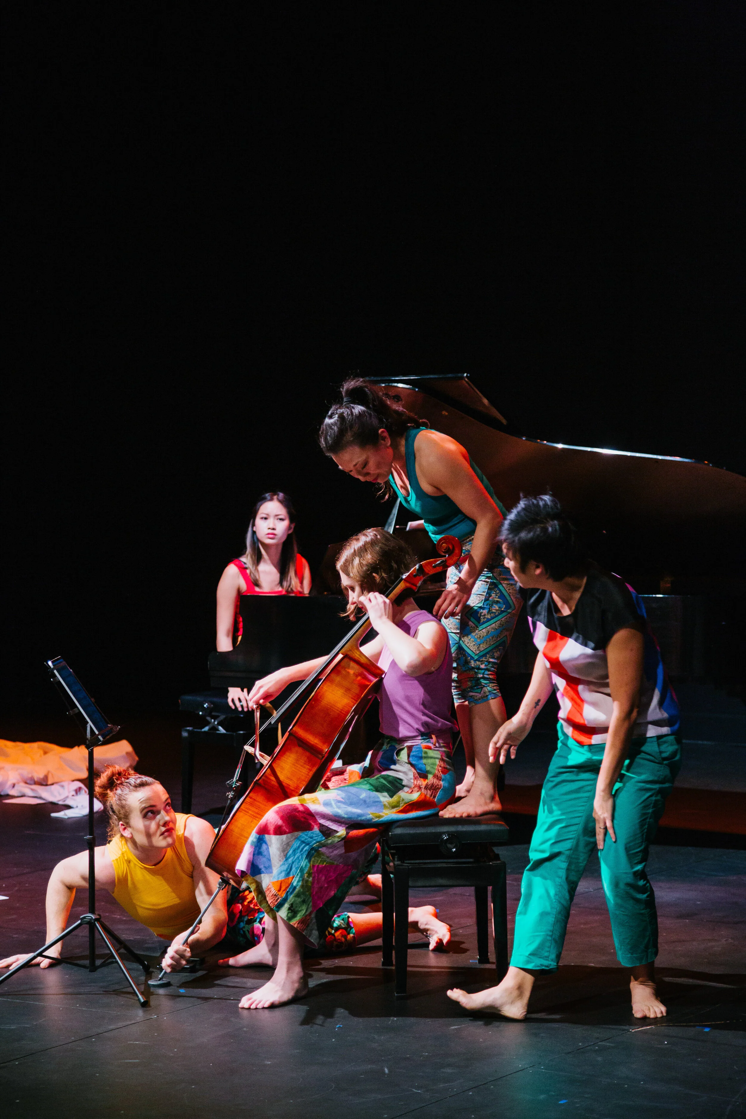 Pre-performance, I was drawn to the burnt orange lighting state reflecting off a glistening black piano, and I found myself returning to the roundness of two skirts splayed out on the floor. The musicians took to the stage in vintage white dresses, opening the scene with the entrancing music of Fanny Mendelssohn’s Piano Trio Op. 11-2 Andante espressivo (1846). This movement begins and ends gently with the piano, played exquisitely by Cara Tran. The additional layer of the strings in this rich soundscape was handled brilliantly in tandem by violinist Flora Wong, and celloist Francesca Masel.