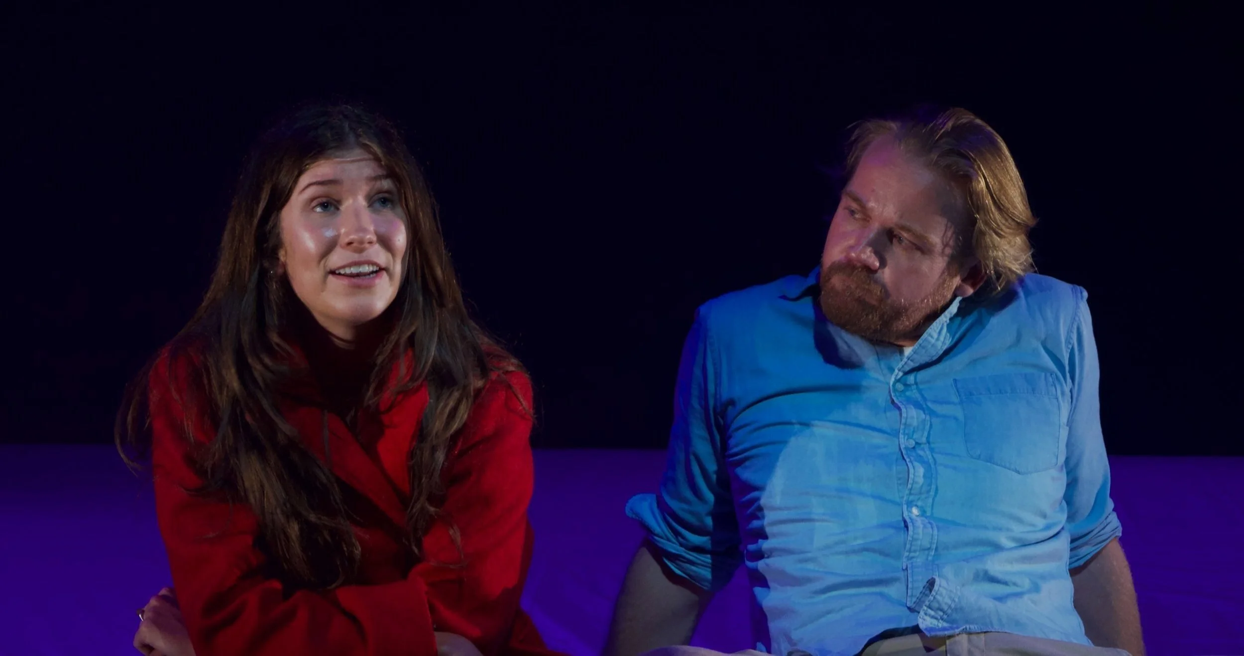 The entirety of the play is set out like chapters in a book, with chapter titles being projected onto the back wall of the stage on which Jon narrates the affair in past tense as it plays out in present in monologue-form to the audience. As an audience member, this skeletal device from the playwright which director Tim Hill has transferred onto the stage, throws you straight into the narrative and you feel like you’re flipping pages of a book, not sure what fate awaits the characters at the end, but you’re starting to get ideas…