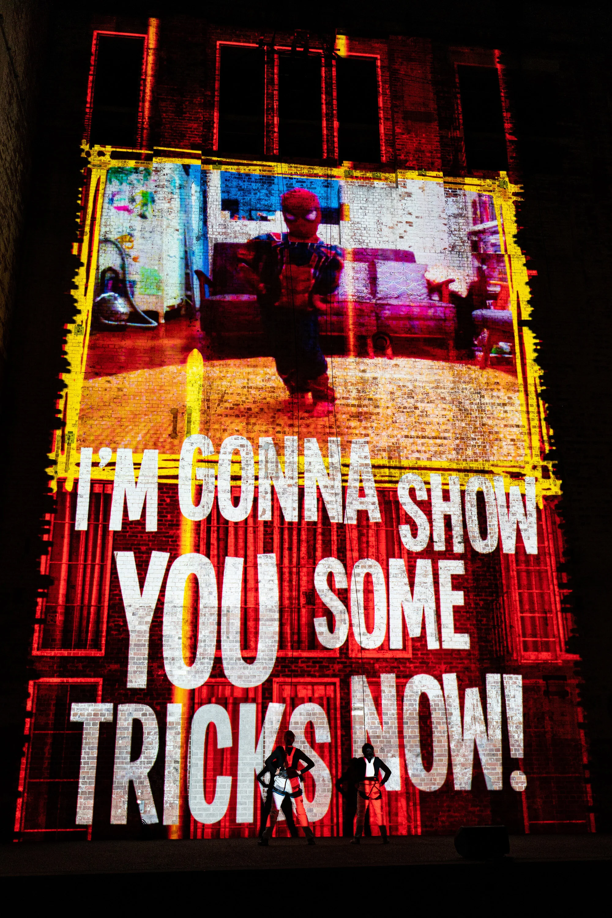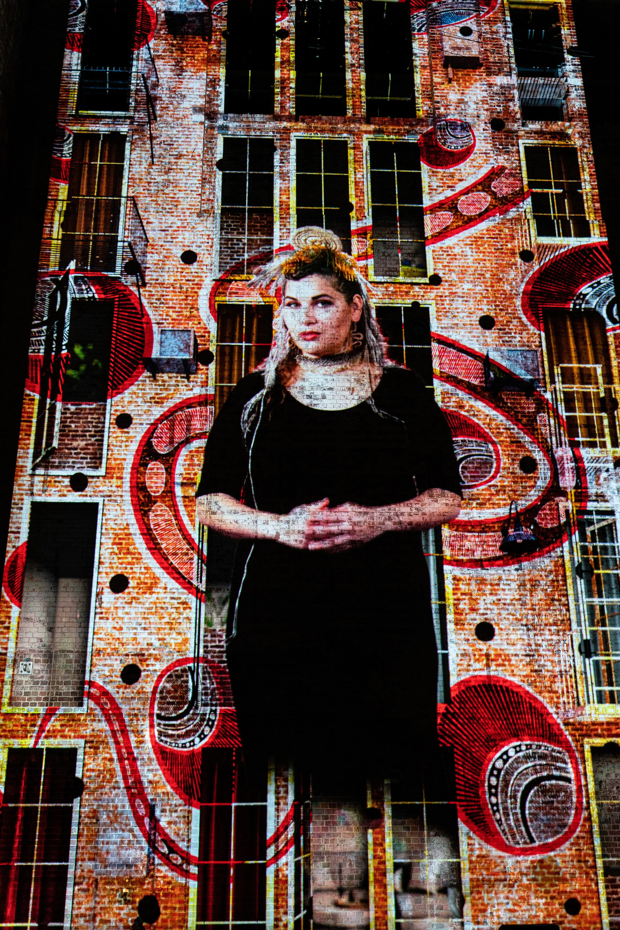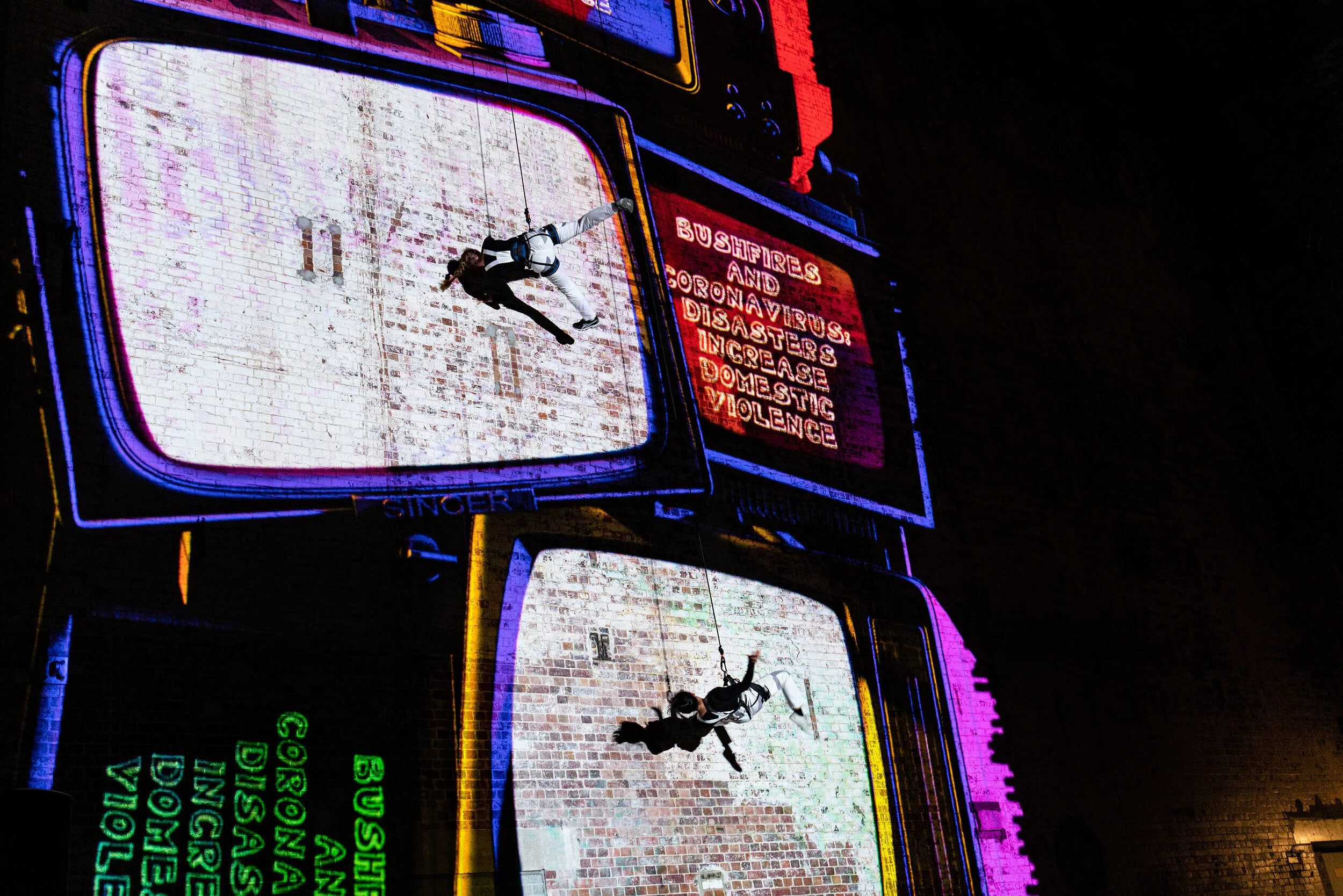 Combined to absolutely exquisite effect in projections brought together by Craig Wilkinson of Optikal Bloc, we were able to peek into the window of artists lives and share their triumphs and joys in this strangest of years. Part emotional confessional, part self-indulgent community purge, part colourful extravaganza, it was complimented by two talented aerial acrobats. Suspended on abseil lines, Mayu Muto (Casus, GUSH) and Amanda Lyn-Pearson (Crack Up Sisters) spun, twirled, catapulted and ran up the 20 meter walls, throwing their bodies into the projections and adding a dangerous human element to the display.