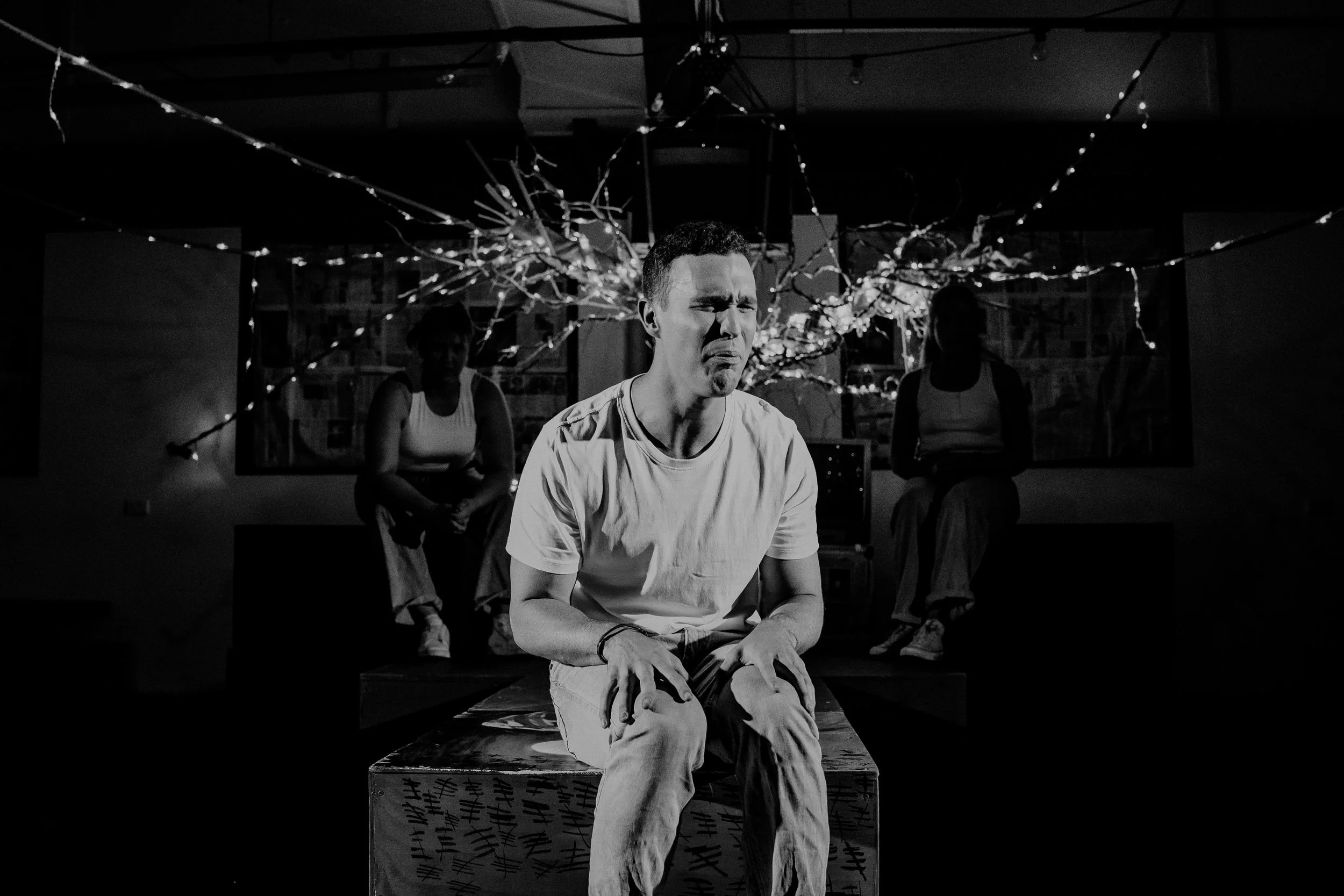 The show opens with a fabulously macabre darkened stage, three actors slumped amid boxes transfixed by a television showing a warp of images, from tangerine skies to violence to static blurred images of ordinary days. A slow burn for the performers over more than fifteen minutes as the audience enters, jostles, collects wine and settles. I wonder idly what kind of reflections pass through their minds each night as they wait in the inbetween zone for us to be seated.