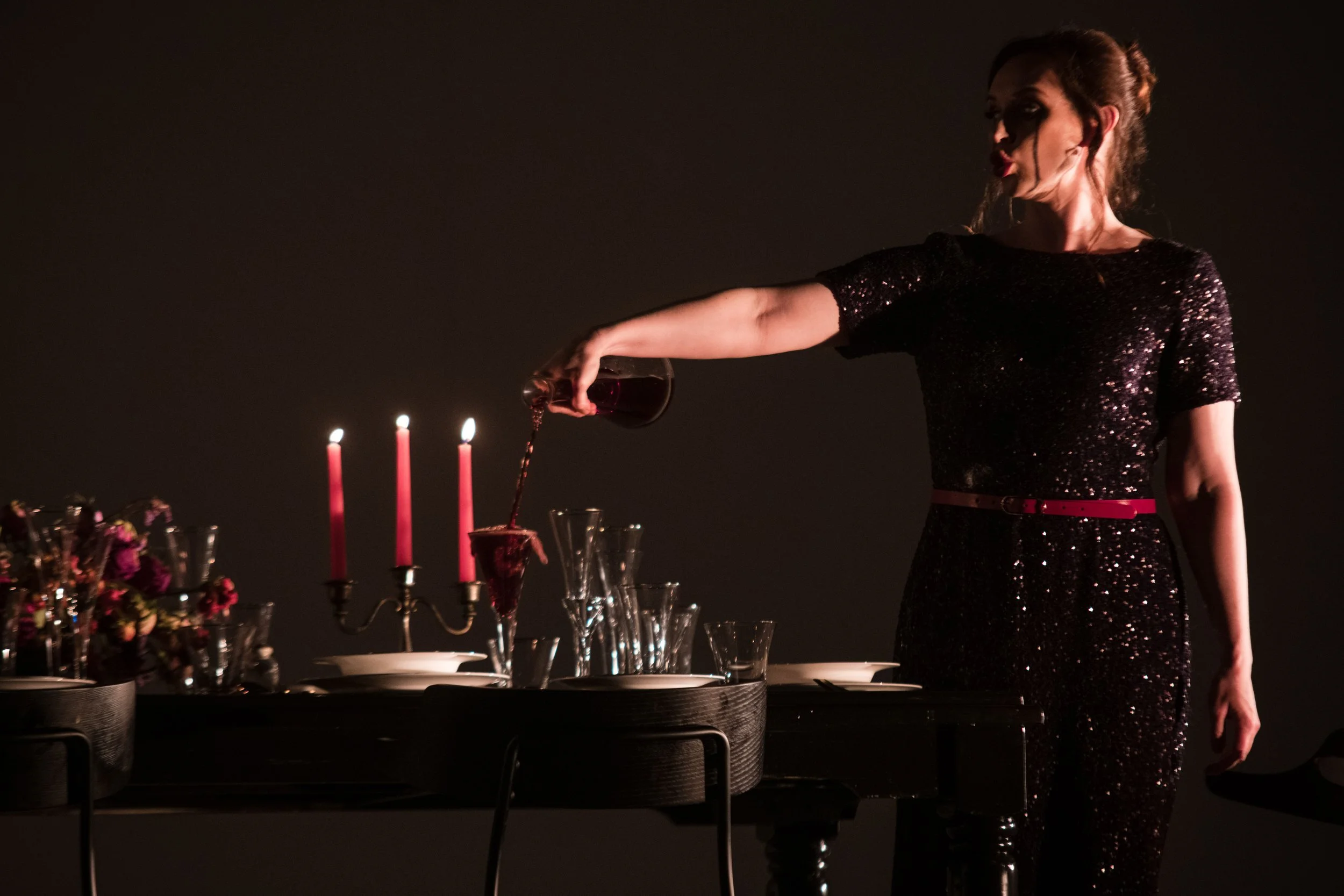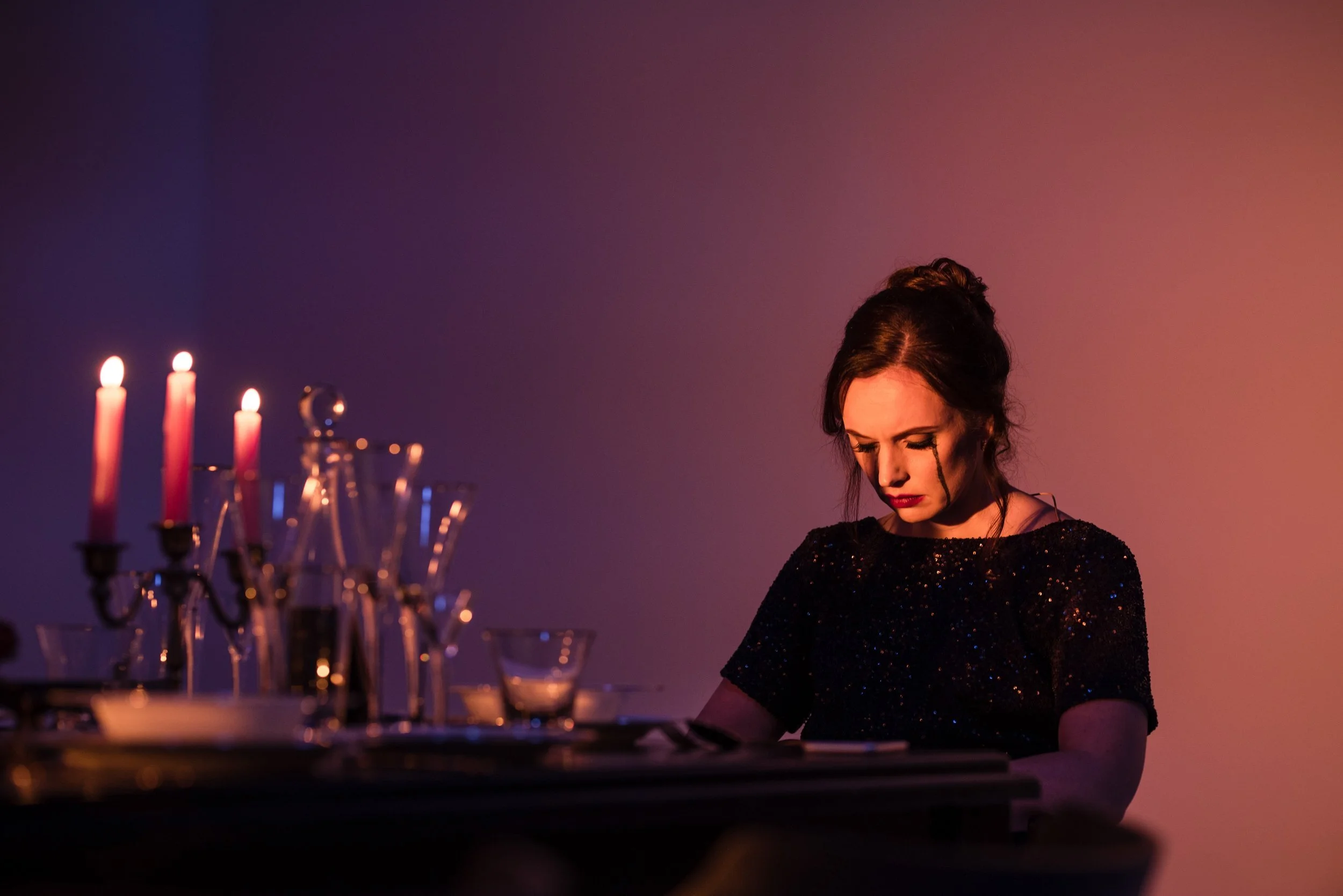 The Human Voice is performed first and presented the audience with a more traditional opera experience. There is a woman in a very fancy dress, sitting at a very fancy dinner table, and she sings very fancily. This is not to minimise the quality of the costume or set design nor that of Alexandra Flood’s performance as Elle; all three are splendid. I enter the Concert Hall and Elle is waiting for us onstage. She sits at a fully set dinner table and stares blankly, longingly, harrowingly at her phone.