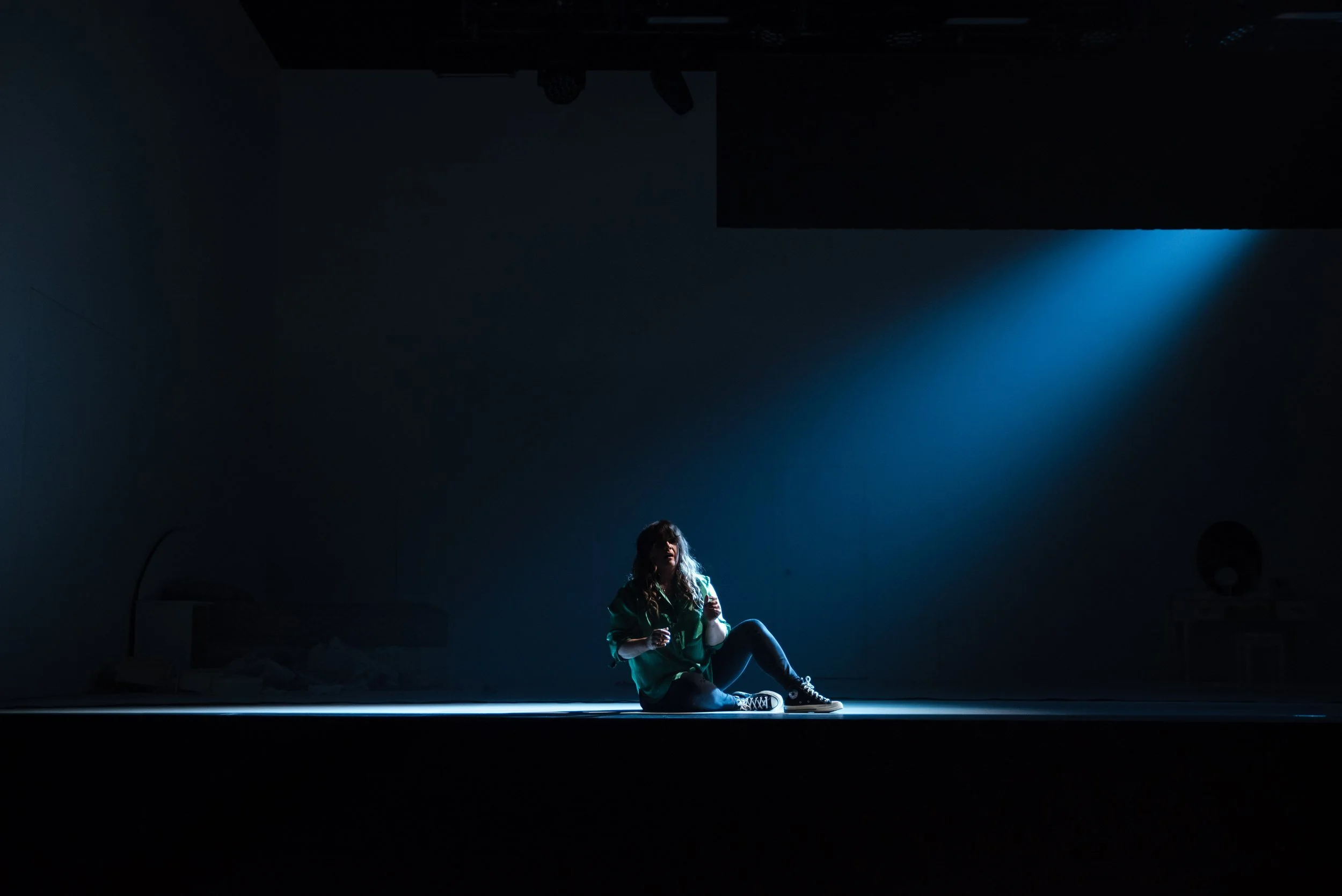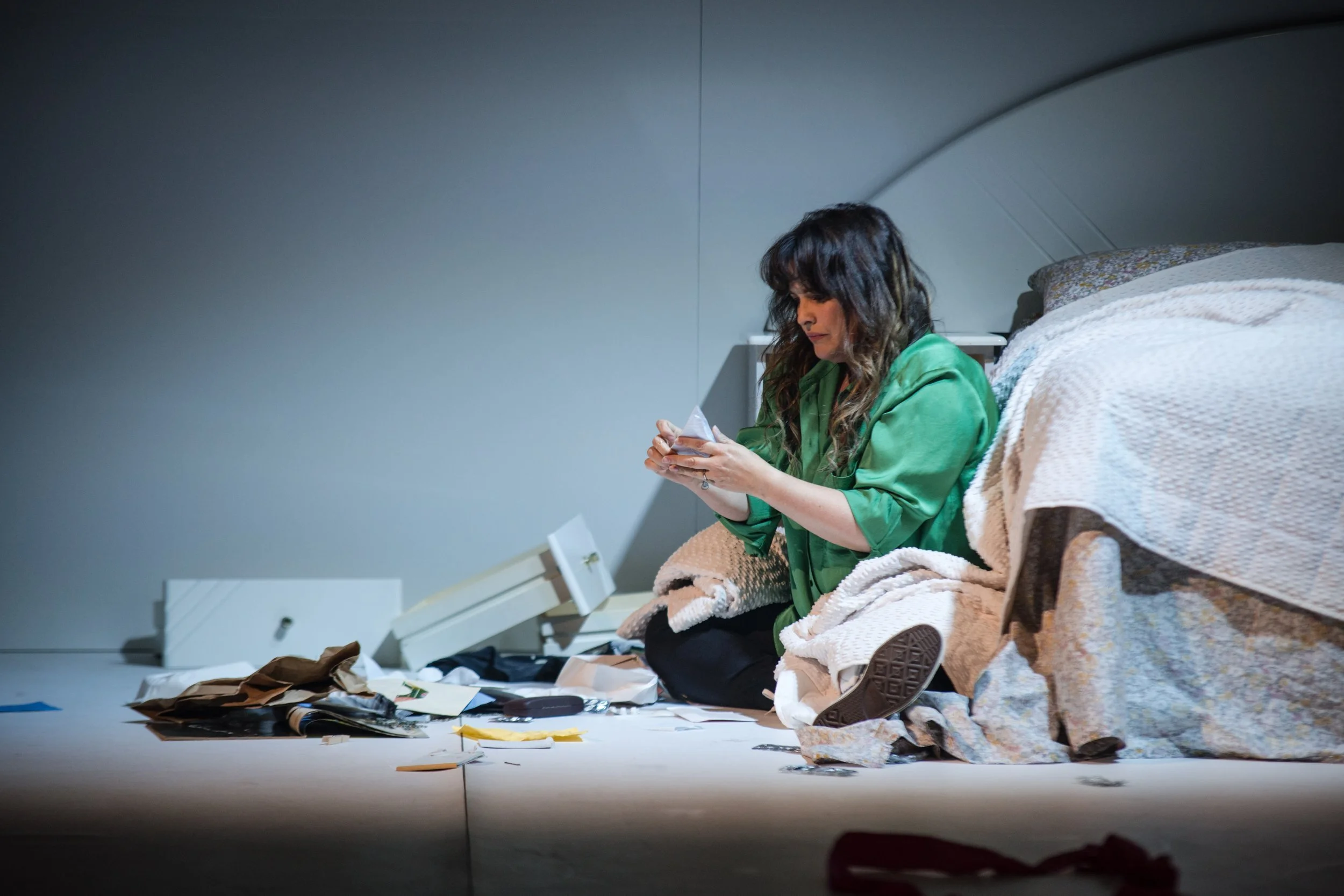 Me and anyone I’ve ever met who’s attracted to men have experienced this woe firsthand. The mental gymnastics of figuring out what a boy’s texts mean, if he’s going to call us, whether we are wasting our time trying to date him, if we’re crazy for feeling the need to solve these puzzles at all. The Human Voice puts that emotional experience on steroids in classic opera fashion. Elle’s yellow socks the perfect touch of comfort and humanity amongst the epic almost mythic nature of the drama. The composition, the performer, and the lighting all work in tandem in curate a sense of delusion and madness from the offset of the piece that crescendos until we reach Elle’s breaking point, the same point at which the opera ends. All-in-all an entertaining and harrowing examination of the consuming nature of love and a warning against loving someone so completely you lose yourself.