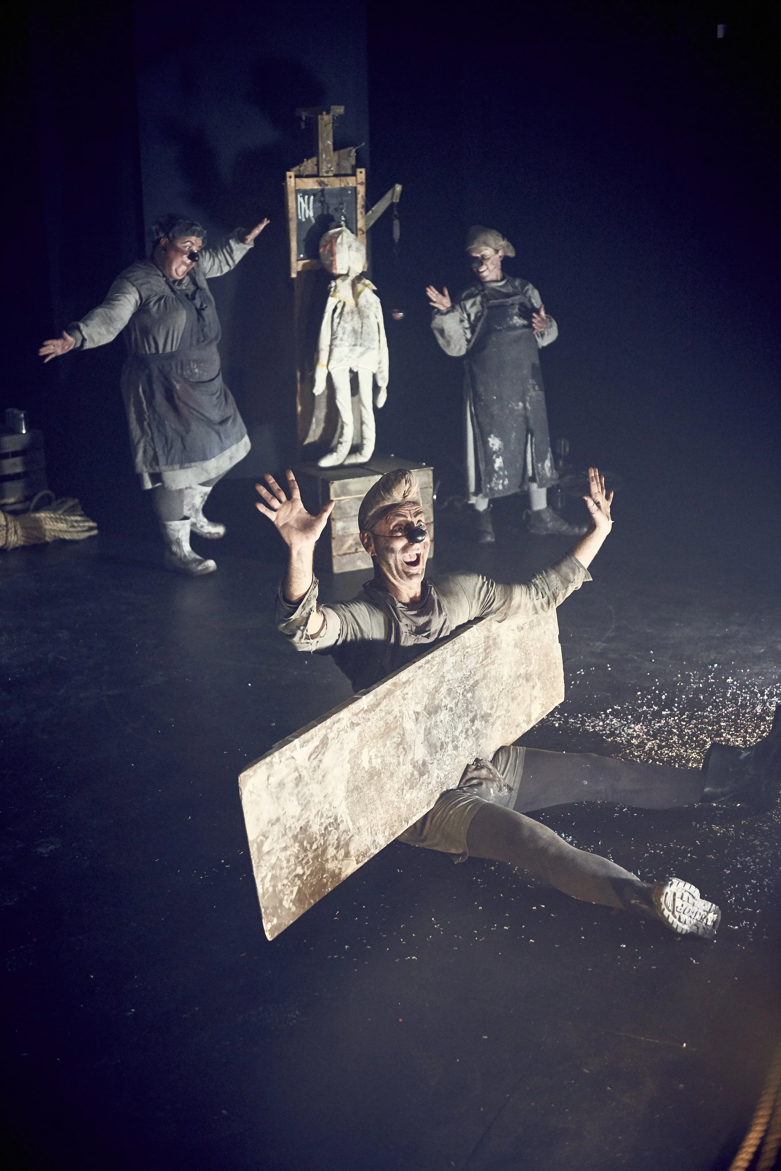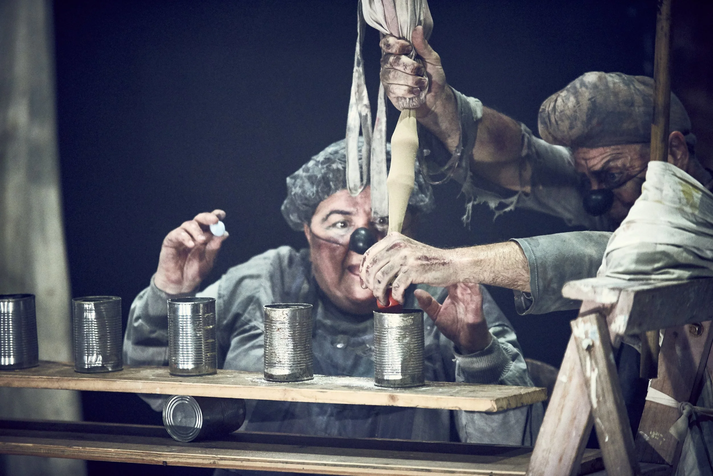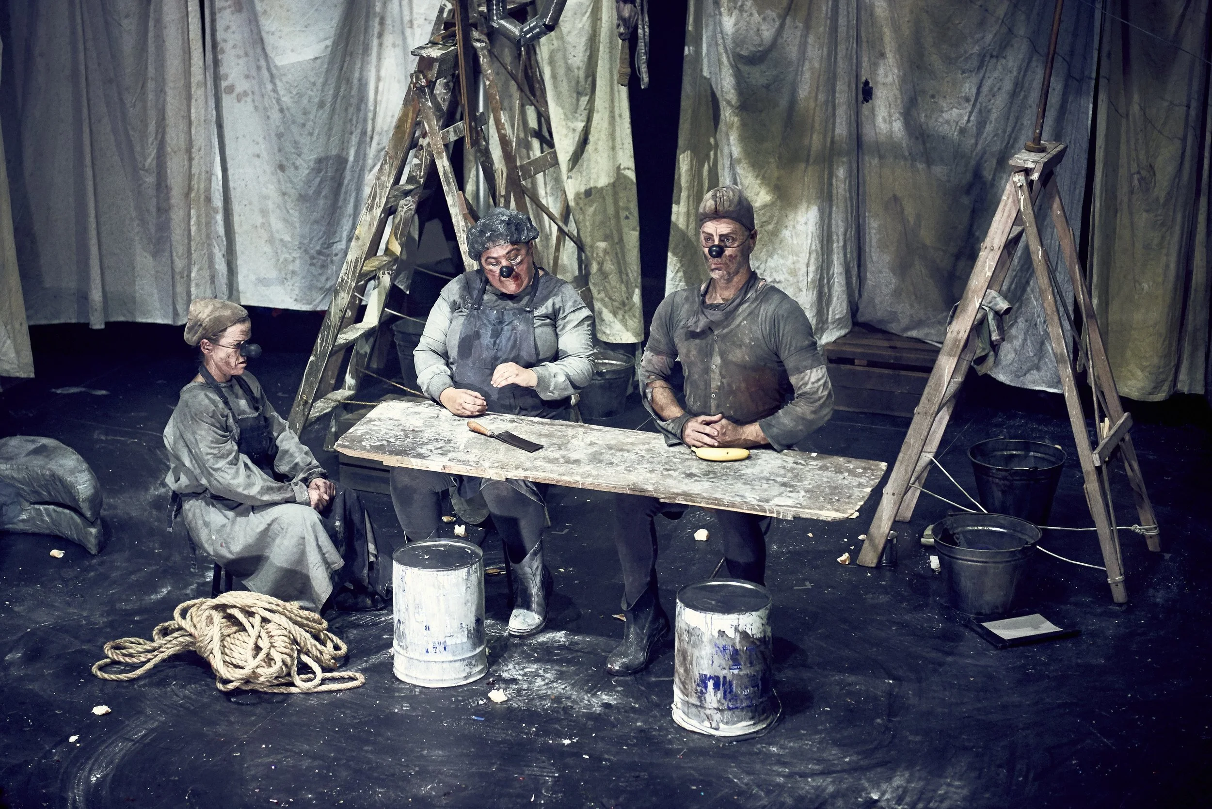 Materialising out of the darkness a grimy trio shuffle ritualistically in circles, sharing verbalisations and unpacking an impressive collection of paraphernalia to set up a very serious production line. Immediately I am reminded of some of the well-known trios in the history of entertainment, like Macbeth’s witches, or even the Three Stooges. It’s recognizable in the physical language these artists share, and how they hold themselves as a consequence of the visceral and embodied way in which they work.