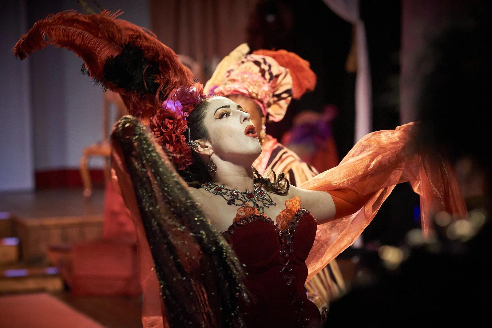 The Curators have established themselves a reputation for elaborate costuming and setting and the Revolutionists is no different. Their home in Milton’s Christ Church has been transformed into a lush Parisian parlour, adorned with what could be kilometres of fabrics for the Revolutionists. Combined with lighting design by Bethany Scott, the characters are effectively highlighted and silhouetted throughout the piece to great effect. Combined with the attention to detail on the intricate costuming and make-up, I was transported into the world of the French Revolution.