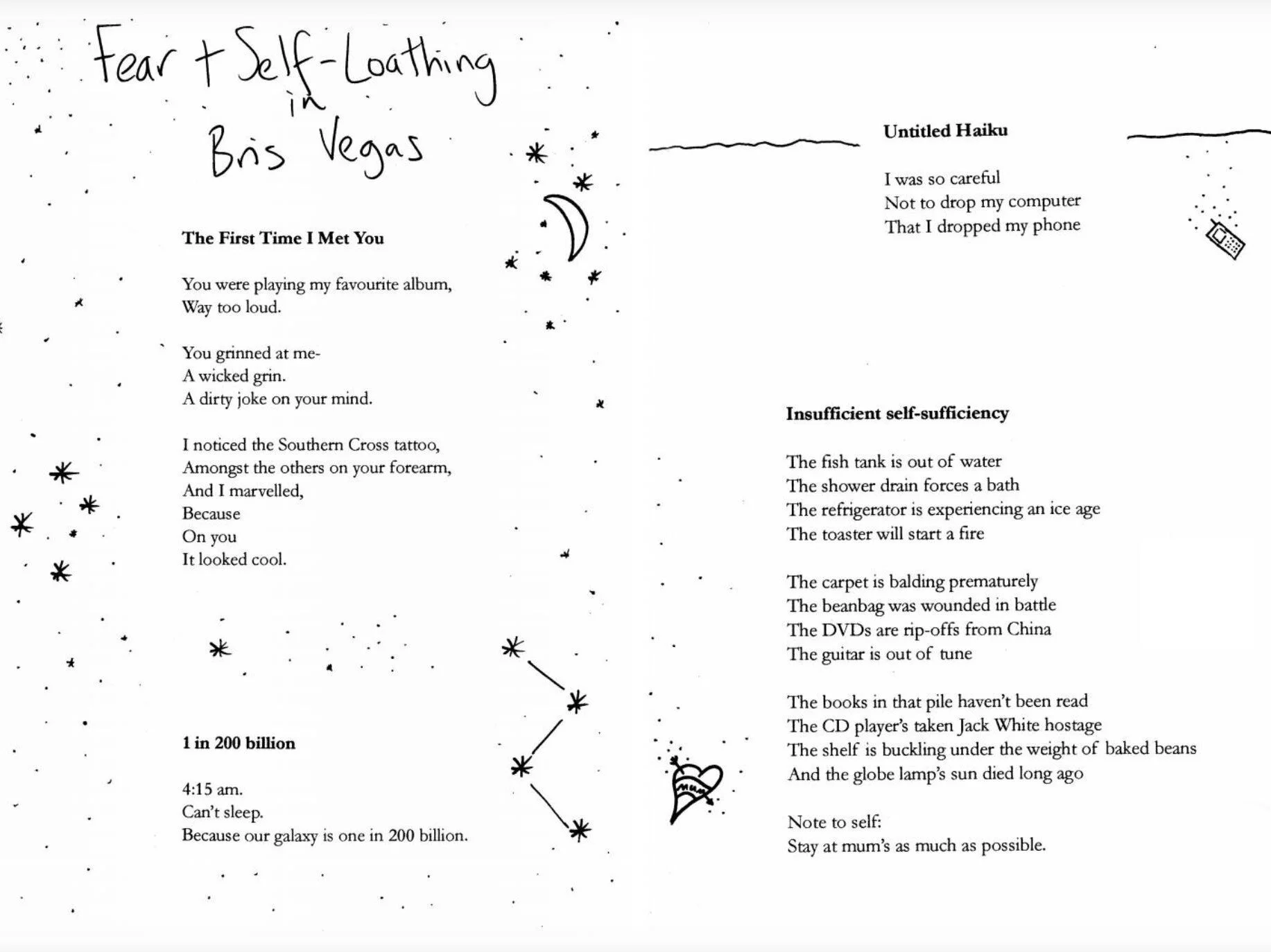 IBIS is a free zine that you won’t find picking through bins for a snack. You will, however, find it in unusual places around the streets of Brisbane. Curated by a team of editors – Rhiana, Jamie, Jack and Seamus –, IBIS is a magnificent mishmash of stories, poems, drawings, photographs and political commentary. The team started IBIS to ‘create an accepting, open platform for anyone who wanted to share their creativity with the community’ and they publish on a ‘when we get our shit together’ basis. Inside you will find content with a distinctive Brisbane flavour, including armies of bin chickens, photographs of old Queenslanders and an illustration of a woman in her bedroom masturbating to a Brisbane City Guide exclaiming ‘I-I-I’ve got a B-B-Brisboner’.